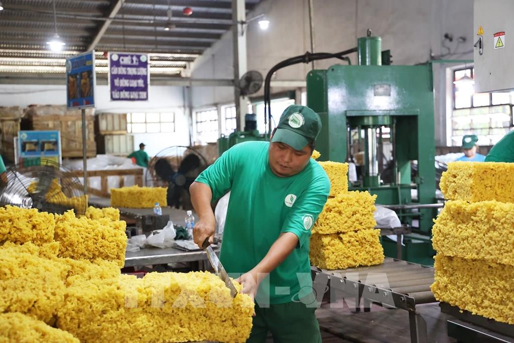 Cân mủ cao su để đưa vào khuôn ép. Ảnh: Hồng Đạt - TTXVN
