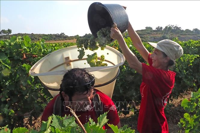 Công nhân thu hoạch nho tại Fitou, Pháp. Ảnh: AFP/TTXVN