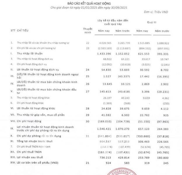 Đóng góp vào lợi nhuận trước thuế, đáng chú ý là lãi thuần từ hoạt động đầu tư chứng khoán 9 tháng năm 2025 đạt 145,6 tỷ đồng so với âm 43,6 tỷ đồng cùng kỳ năm trước, phản ánh hiệu quả từ chiến lược đầu tư an toàn và ưu tiên kiểm soát rủi ro. Đồng thời, thu nhập từ hoạt động góp vốn, mua cổ phần quý III năm 2025 đạt 41,59 tỷ đồng, gấp 6 lần so với cùng kỳ năm 2024.