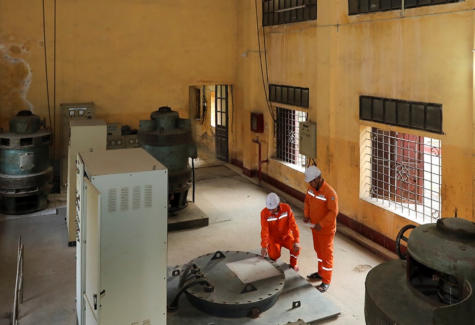 Nhân viên Công ty Điện lực Hưng Yên kiểm tra điện tại trạm bơm Thống Nhất (tỉnh Hưng Yên). Bích Hồng/Bnews/Vnanet.vn