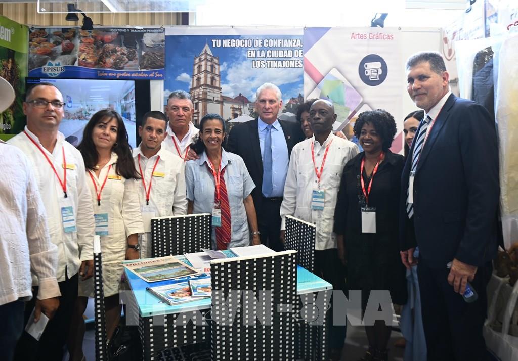 Chủ tịch Miguel Díaz-Canel Bermúdez (giữa) chụp ảnh tại một gian hàng ở Hội chợ. Ảnh: Việt Hùng-P/v TTXVN tại Cuba