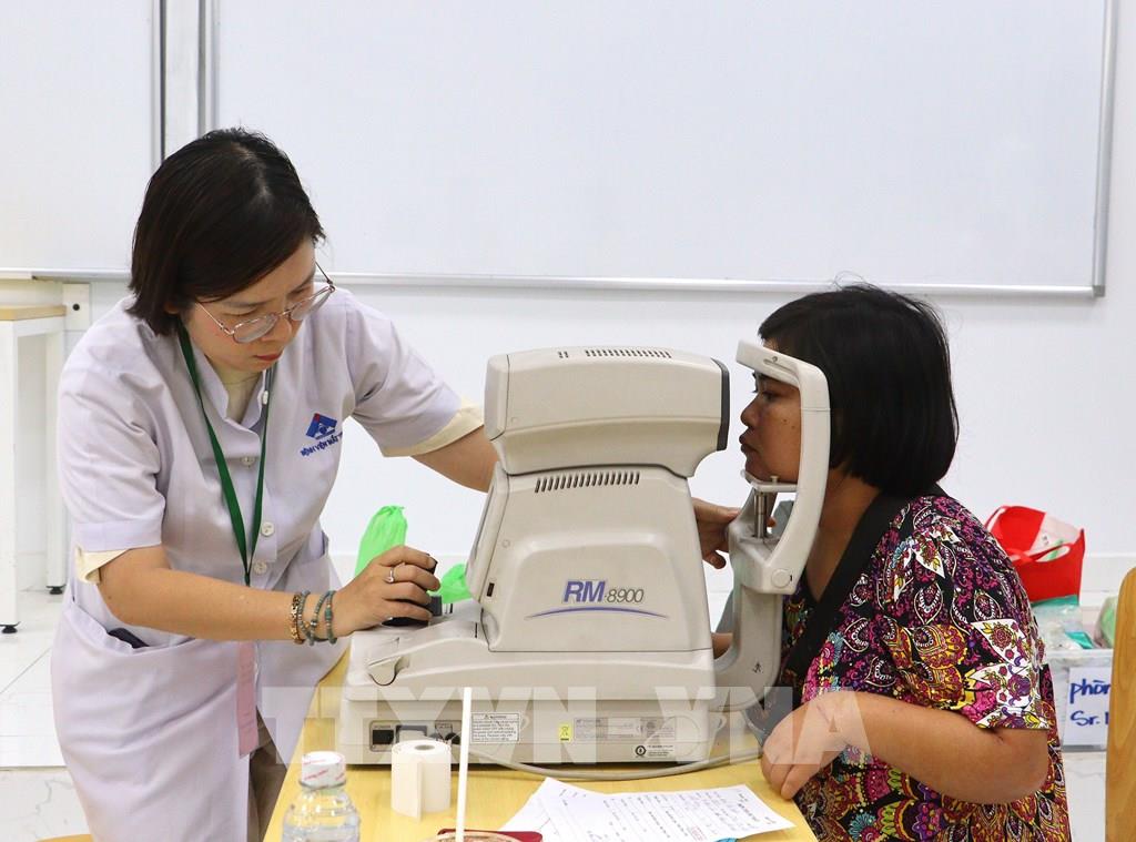 Bác sĩ kiểm tra các bệnh về mắt và đo thị lực cho người dân. Ảnh: Lê Thúy Hằng – TTXVN