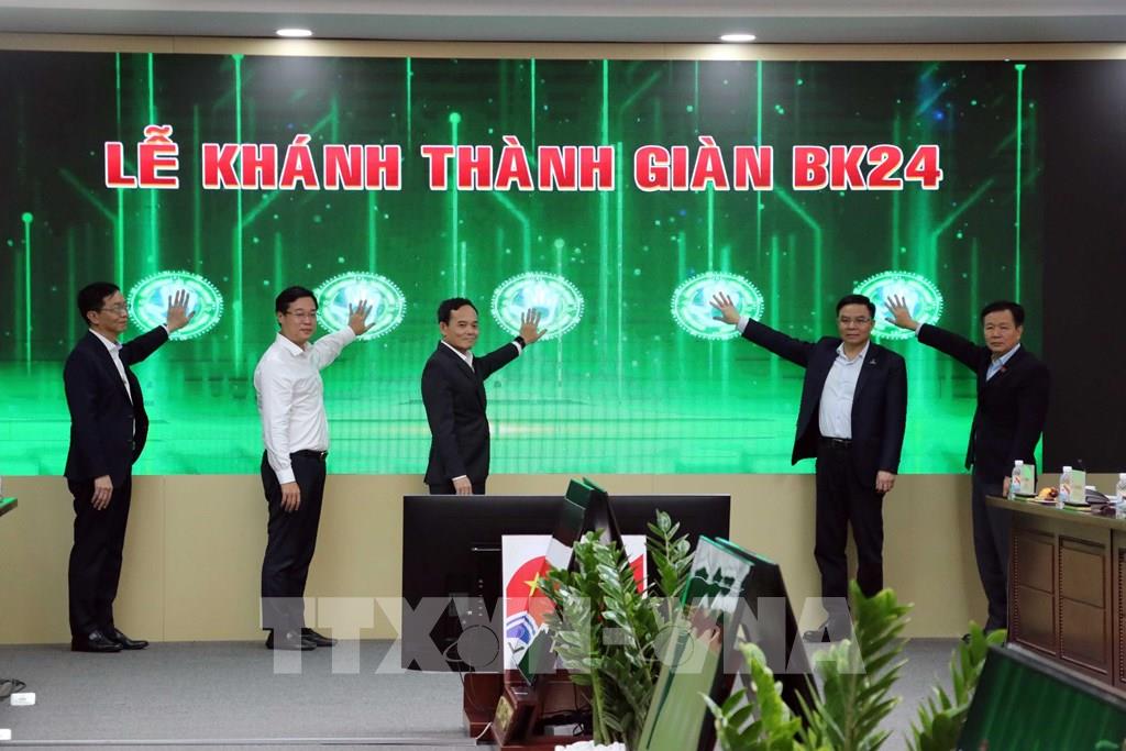 Bí thư Thành ủy Thành phố Hồ Chí Minh Trần Lưu Quang cùng thực hiện nghi thức khánh thành Giàn đầu giếng BK-24 của Liên doanh Việt - Nga Vietsovpetro. Ảnh: Đoàn Mạnh Dương-TTXVN
