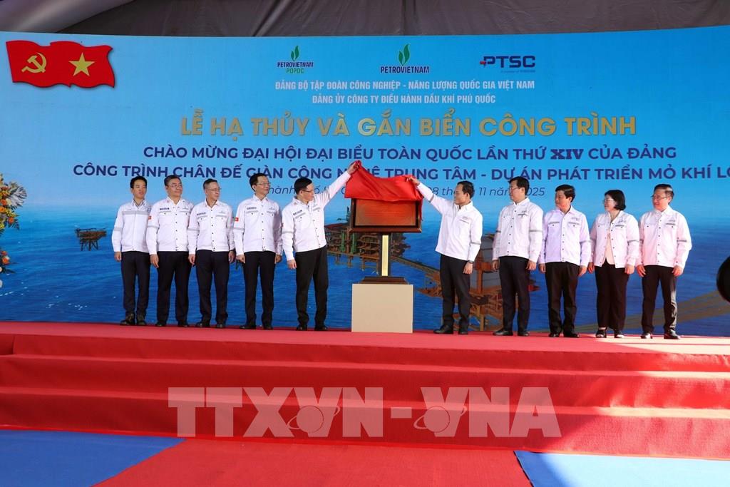 Bí thư Thành ủy Thành phố Hồ Chí Minh Trần Lưu Quang cùng lãnh đạo các đơn vị thực hiện nghi thức gắn biển công trình Chân đế khối thượng tầng Giàn công nghệ trung tâm (CPP). Ảnh: Đoàn Mạnh Dương-TTXVN