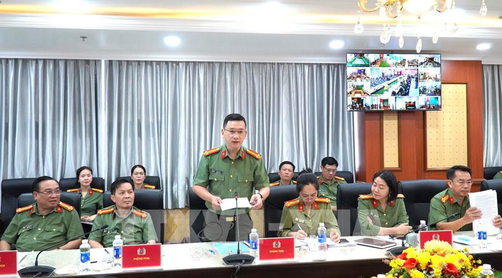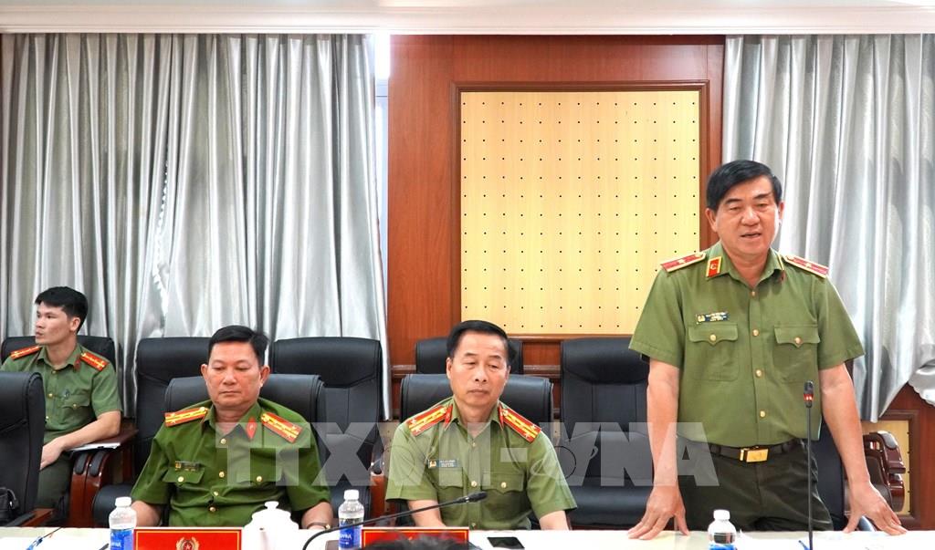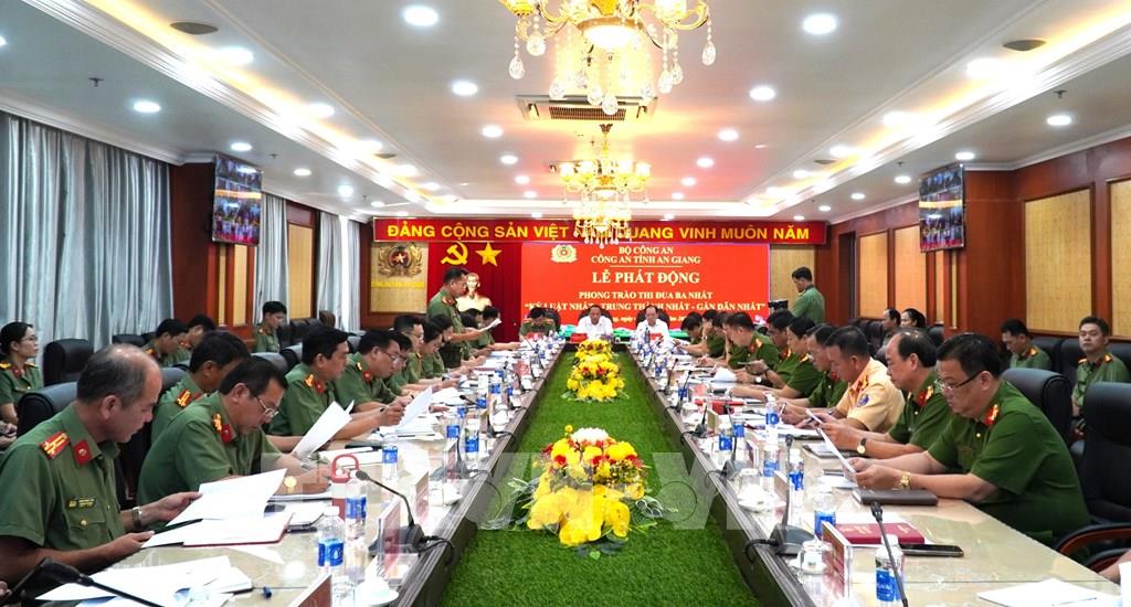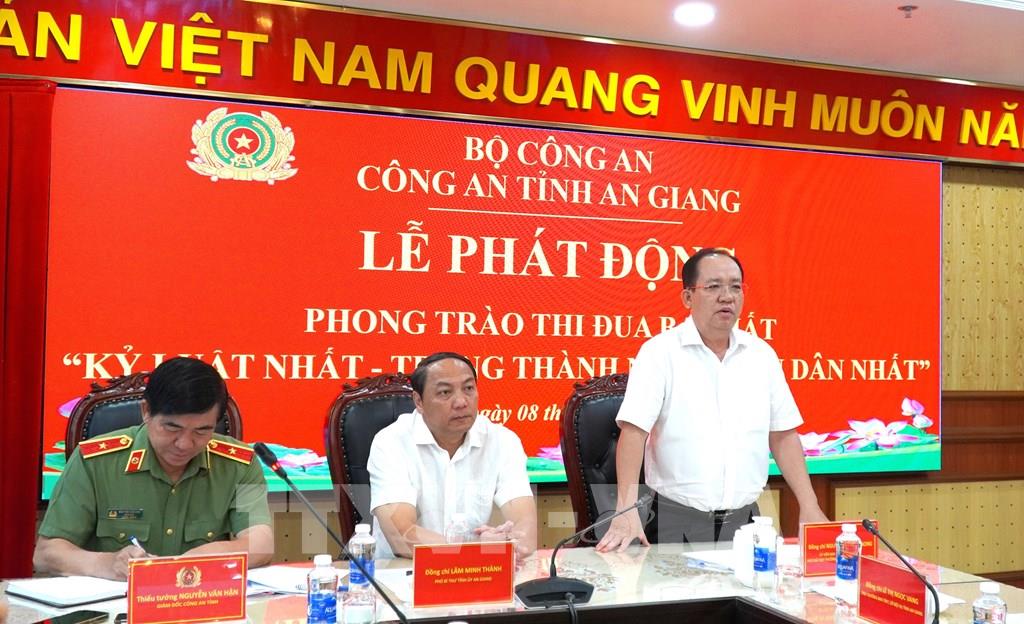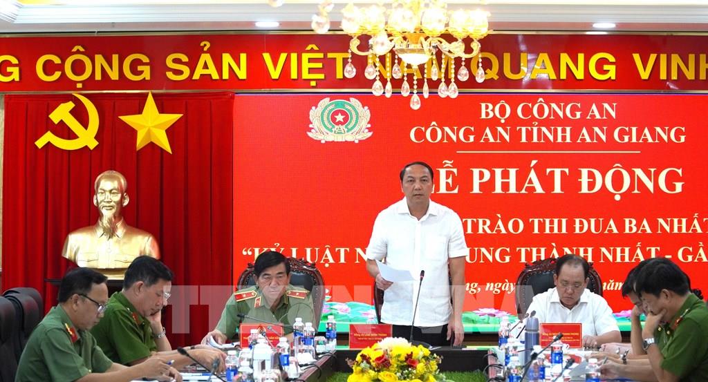 Thiếu tướng Nguyễn Văn Hận, Giám đốc công an tỉnh An Giang, phát động phong trào thi đua “Ba nhất: Kỷ luật nhất - Trung thành nhất - Gần dân nhất”. Ảnh: Văn Sĩ - TTXVN
