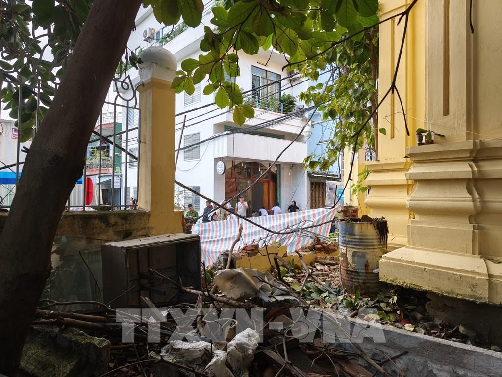 Hiện trường vụ gãy cẩu tháp làm sập tường rào của Bảo tàng điêu khắc Chăm Đà Nẵng. Ảnh: Quốc Dũng - TTXVN