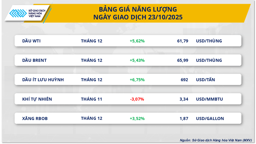 Thị trường năng lượng phiên hôm qua ghi nhận lực mua áp đảo với 4 trên 5 mặt hàng đồng loạt tăng mạnh. Nổi bật trong đó là hai mặt hàng dầu thô với mức tăng mạnh nhất kể từ tháng 6 vừa qua.Cụ thể, giá dầu WTI trong phiên hôm qua đã tăng vọt 5,43%, lên mức 61,79 USD/thùng, đánh du lần đầu tiên quay trở lại trên ngưỡng 60 USD/thùng kể từ ngày 9/10. Tương tự, giá dầu Brent cũng nằm trong đà tăng của thị trường khi chạm mốc 65,99 USD/thùng - mức cao nhất trong hai tuần trở lại đây, tương đương mức tăng khoảng 5,62%.