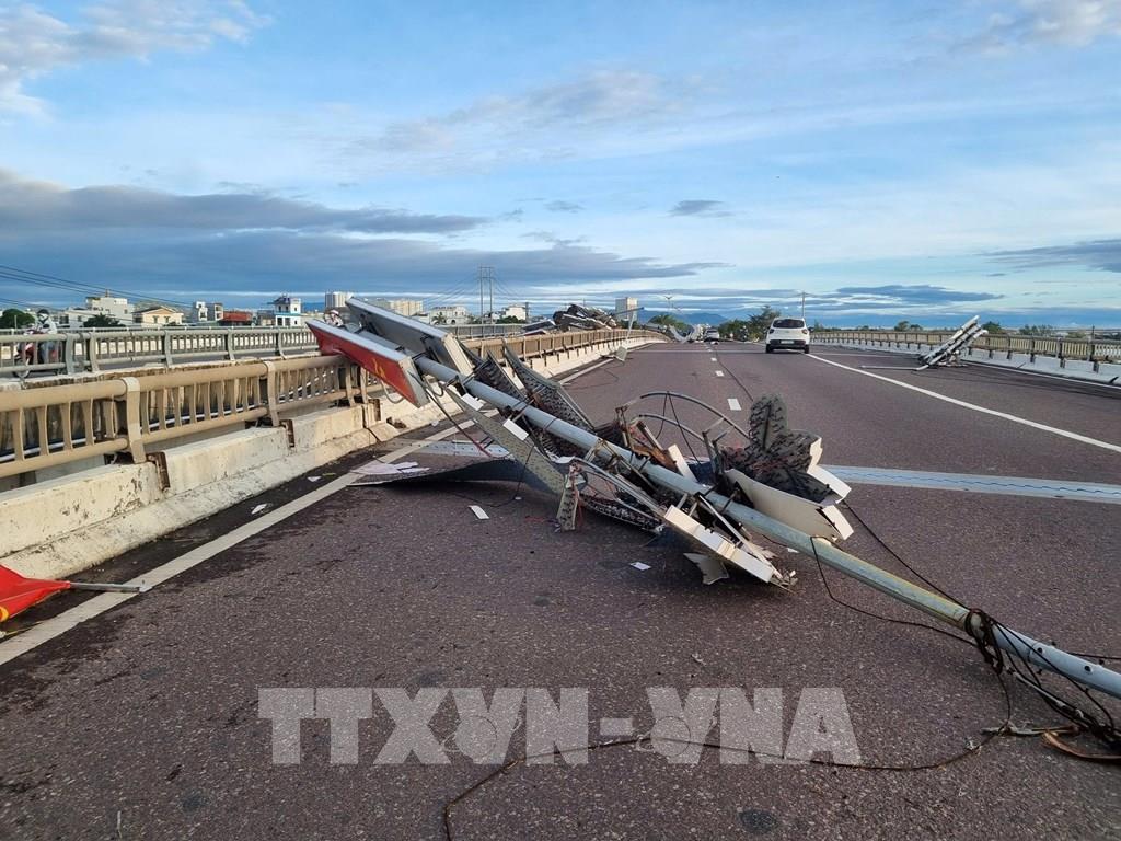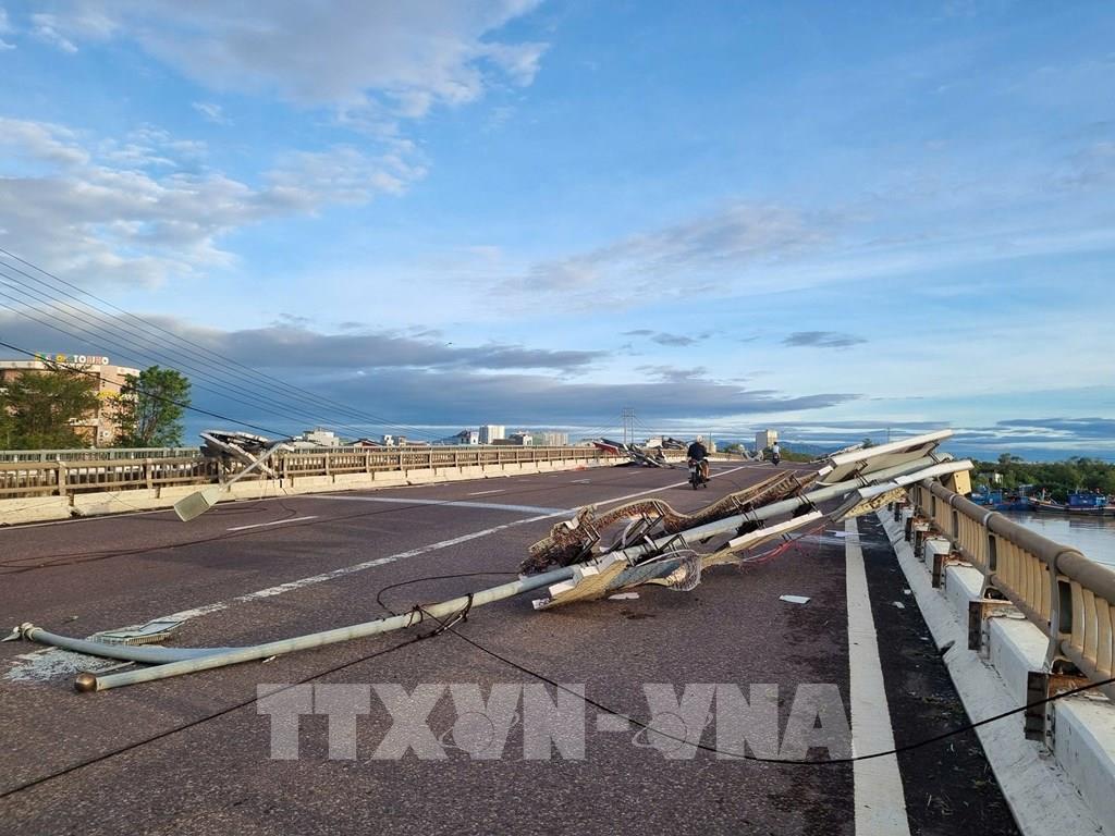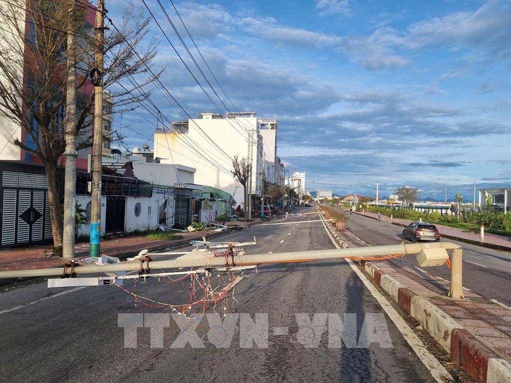 Hệ thống điện chiếu sáng bị tê liệt do bão số 13. Hàng loạt trụ điện chiếu sáng trên tuyến đường Đống Đa hướng ra Cảng Quy Nhơn bị bão số 13 quật ngã. Ảnh: Quang Thái- TTXVN