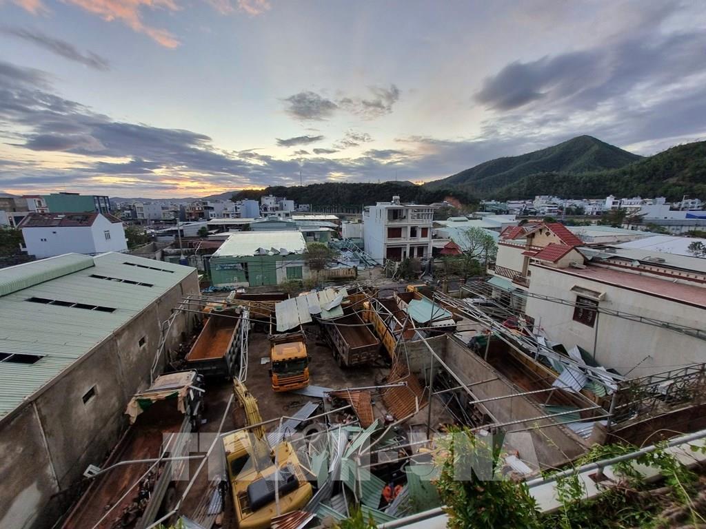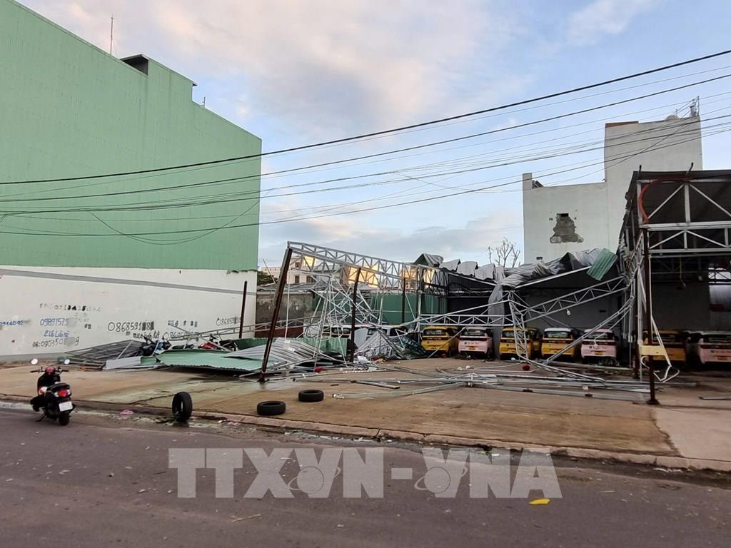Nhiều nhà kho, nhà xưởng, dịch vụ bị tốc mái hoàn toàn tại phường Quy Nhơn Đông, tỉnh Gia Lai. Ảnh: Quang Thái- TTXVN