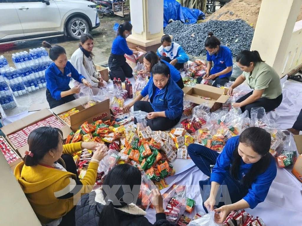 Đoàn viên thanh niên các xã phía Tây tỉnh Gia Lai đóng gói hàng hóa gửi về cứu trợ đồng bào lũ lụt. Ảnh: Hồng Điệp - TTXVN
