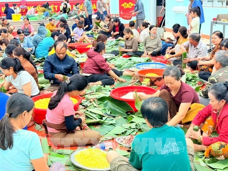Lực lượng quân đội và nhân dân các xã phía Tây tỉnh Gia Lai gói bánh chưng gửi về cứu trợ đồng bào lũ lụt. Ảnh: Hồng Điệp - TTXVN