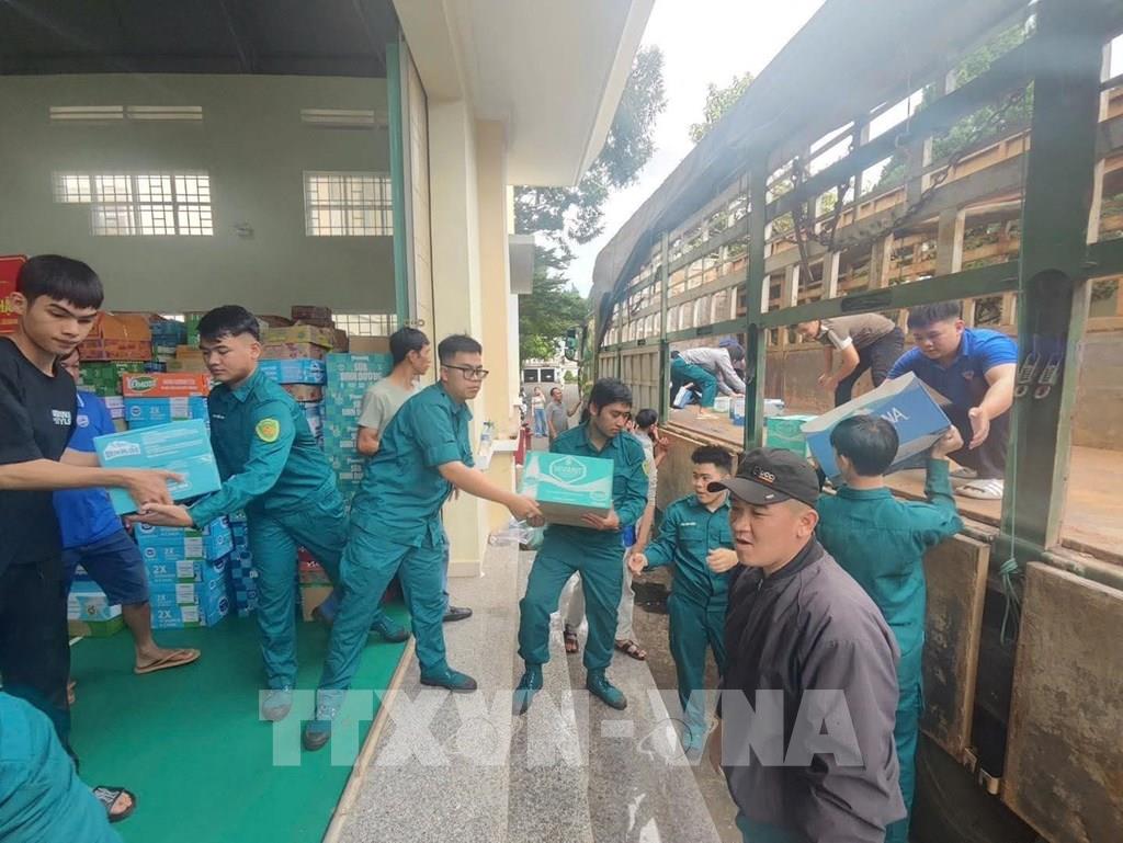 Lực lượng quân đội và nhân dân các xã phía Tây tỉnh Gia Lai sắp xếp hàng hóa gửi về cứu trợ đồng bào lũ lụt. Ảnh: Hồng Điệp - TTXVN