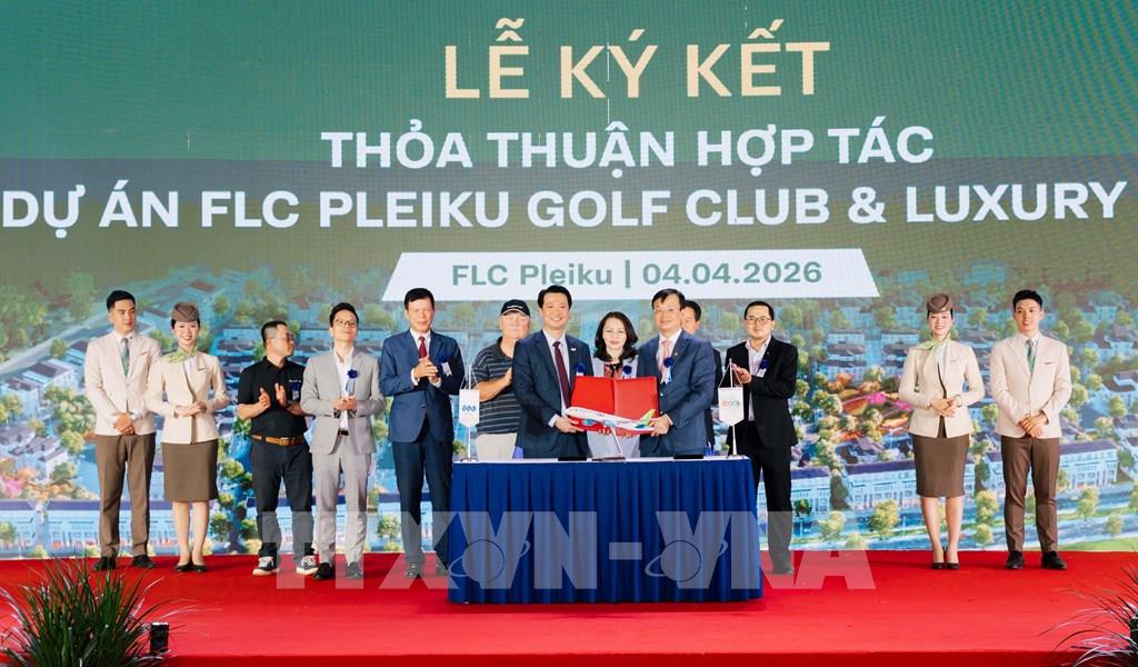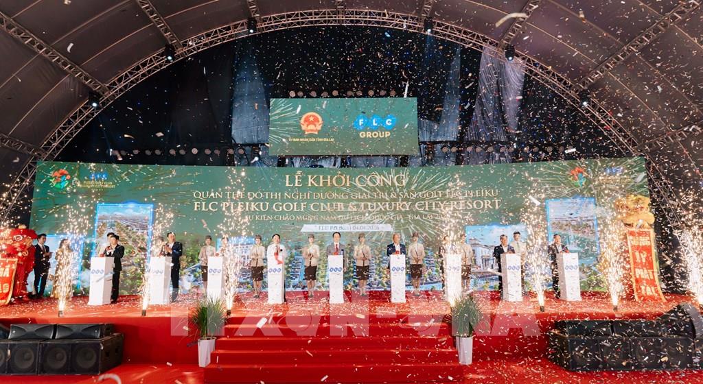 Lãnh đạo tỉnh Gia Lai và đại diện doanh nghiệp thực hiện nghi thức khởi công Quần thể đô thị nghỉ dưỡng, giải trí và sân golf FLC Pleiku Golf Club & Luxury City Resort. Ảnh: Hoài Nam – TTXVN