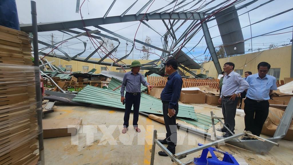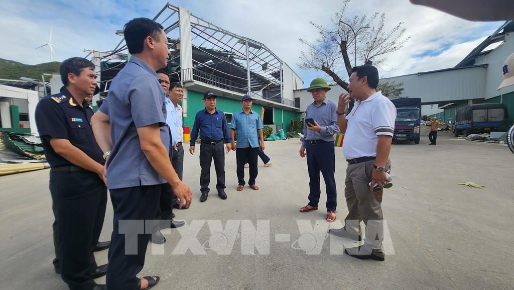 Chủ tịch UBND tỉnh Gia Lai Phạm Anh Tuấn (đội mũ cối) kiểm tra công tác khắc phục bão số 13 ở các doanh nghiệp khu kinh tế Nhơn Hội. Ảnh: Sỹ Thắng - TTXVN