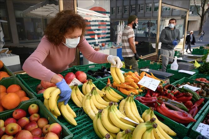 Người dân bày bán trái cây tại một khu chợ ở Geneva, Thụy Sĩ. Ảnh: AFP/ TTXVN