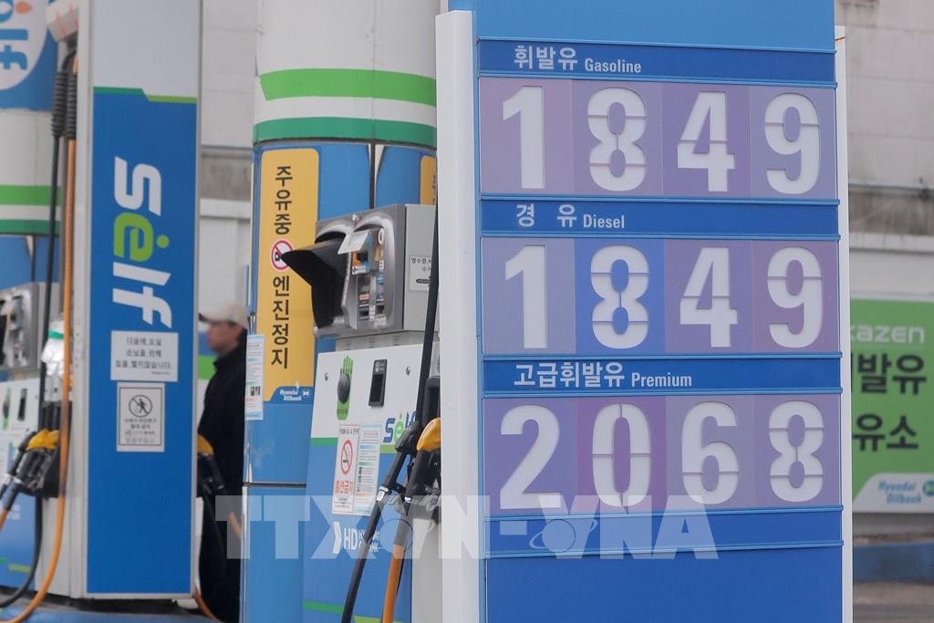 Giá xăng dầu được niêm yết tại trạm xăng ở Seoul, Hàn Quốc. Ảnh: Yonhap/TTXVN