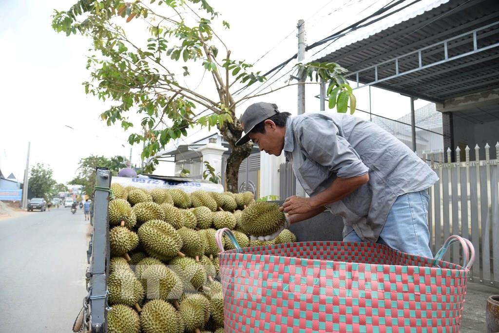 Nông dân Đồng Tháp vận chuyển sầu riêng đi tiêu thụ. Ảnh: Công Trí-TTXVN