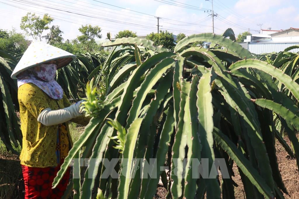 Nhà vườn xã Tân Thuận Bình, tỉnh Đồng Tháp chăm sóc thanh long. Ảnh: Công Trí-TTXVN