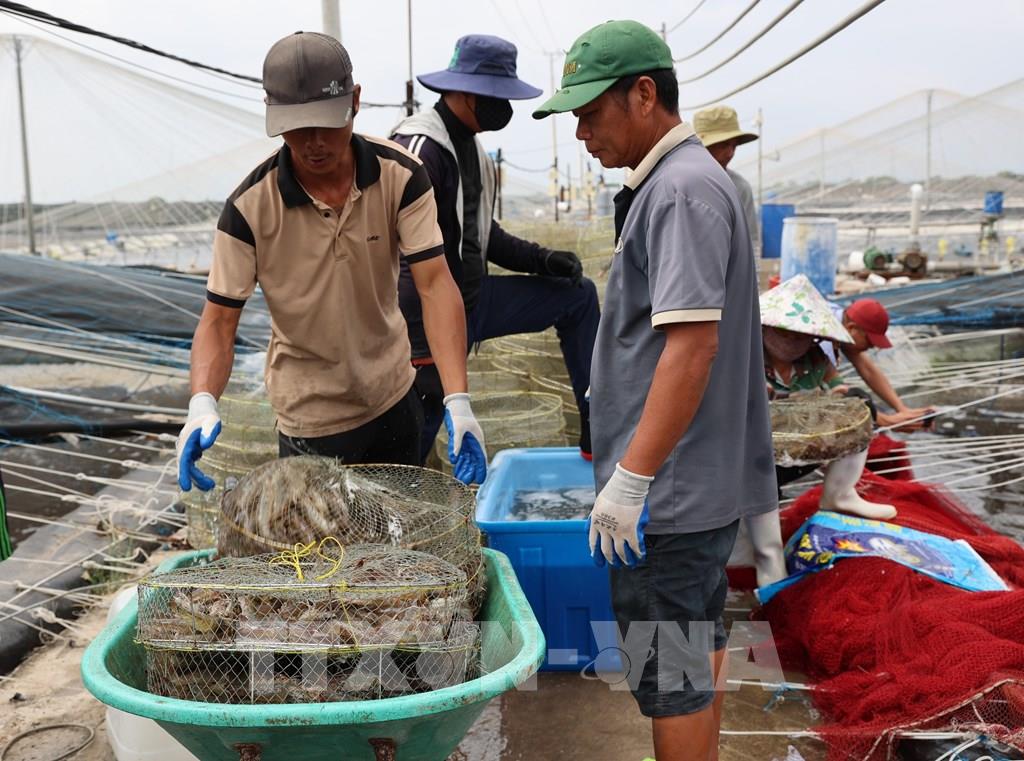Tôm nuôi thương phẩm của Hợp tác xã Chợ Bến, xã Long Điền, mặc dù được thu hoạch đúng vào thời điểm giá tôm tăng cao nhưng hơn 1 tháng nay vẫn chưa thu hoạch xong, do sức tiêu thụ rất chậm. Ảnh: Hoàng Nhị - TTXVN