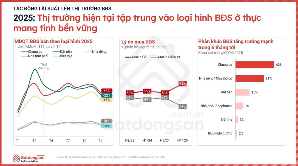 Ông Lực cho rằng, lãi suất thấp nhưng không còn tạo hiệu ứng “sốt nóng” như các chu kỳ trước. Bởi khác với giai đoạn 2017–2021, lãi suất thấp hiện không kích hoạt đầu cơ mạnh. Người mua thận trọng hơn, ưu tiên pháp lý minh bạch, chủ đầu tư uy tín và sản phẩm bền vững. Điều này giúp thị trường tránh được bong bóng, hình thành chu kỳ mới mang tính ổn định dài hạn.Dù lãi suất vẫn là điều kiện cần nhưng không đủ. Ông Lực phân tích, lãi suất không thể một mình quyết định sức khỏe thị trường mà các pháp lý dự án, nguồn cung mới, cải cách thủ tục và niềm tin thị trường… mới là những yếu tố then chốt để tạo nên phục hồi bền vững. Lãi suất thấp chỉ phát huy tối đa khi đi cùng hệ sinh thái minh bạch và nguồn cung đáp ứng đúng nhu cầu.Giai đoạn 2023–2025 đã chứng minh lãi suất là “đòn bẩy mềm” quan trọng cho thị trường bất động sản Việt Nam, vừa hỗ trợ nhu cầu ở thực, vừa giúp doanh nghiệp vượt qua khó khăn, nhưng đồng thời tạo ra một chu kỳ phục hồi ổn định và bền vững hơn, không còn phụ thuộc vào đầu cơ như trước đây. Ông Lực nhận định, tác động của lãi suất vì vậy sẽ tiếp tục là yếu tố định hình thị trường trong năm 2026 và cả giai đoạn tiếp theo.Đánh giá tổng quan thị trường bất động sản Việt Nam, ông Nguyễn Quốc Anh - Phó Tổng Giám đốc kiêm Giám đốc Khối Kinh doanh Batdongsan.com.vn chỉ ra những “điểm cộng” cho TP.Hồ Chí Minh và Đà Nẵng trước cơ hội hình thành Trung tâm Tài chính Quốc tế (IFC).Từ dữ liệu kinh tế – thị trường 2025 cho thấy, Việt Nam đang bước vào giai đoạn ổn định mới với mức tăng trưởng thận trọng nhưng bền vững, tạo nền tảng quan trọng để hiện thực hóa tham vọng xây dựng Trung tâm Tài chính Quốc tế (IFC) tại TP.Hồ Chí Minh và Đà Nẵng. Mặc dù kinh tế toàn cầu tăng chậm, căng thẳng địa chính trị kéo dài và lãi suất cao hơn kỳ vọng, những Việt Nam vẫn duy trì được sự ổn định vĩ mô hiếm có. Lạm phát kiểm soát tốt, tỷ giá linh hoạt, lãi suất duy trì mức thấp hợp lý và tiêu dùng nội địa phục hồi. Đây là những điều kiện cốt lõi mà bất kỳ trung tâm tài chính nào cũng cần.