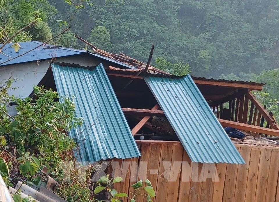 Gió lốc kèm theo mưa lớn khiến hơn 40 nhà dân thuộc 6 bản bị tốc mái, nhiều tài sản của người dân hư hỏng. Ảnh: TTXVN phát