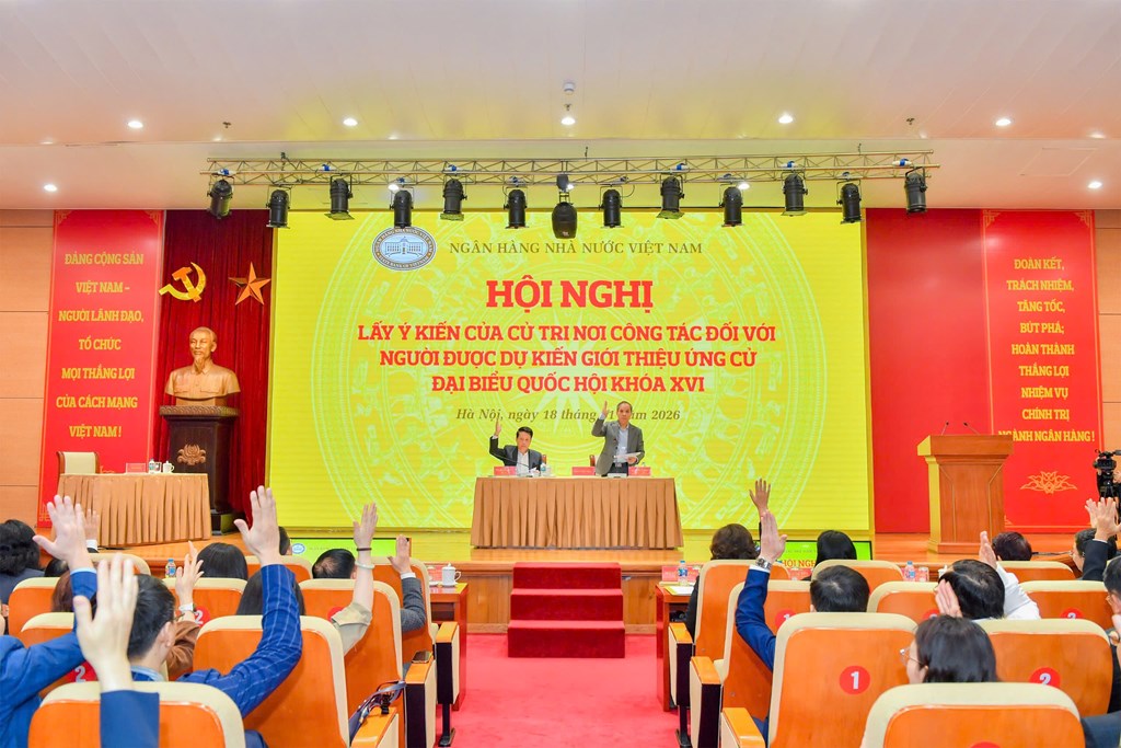 Căn cứ thông báo của Bộ Chính trị, Ban Bí thư và các quy định, hướng dẫn của Ủy ban Thường vụ Quốc hội, Ủy ban Trung ương Mặt trận Tổ quốc Việt Nam về công tác dự kiến giới thiệu nhân sự ứng cử đại biểu Quốc hội, ngày 18/01, Ngân hàng Nhà nước Việt Nam (NHNN) đã tổ chức Hội nghị lấy ý kiến của cử tri nơi công tác với đồng chí Nguyễn Thị Hồng - Ủy viên BCH Trung ương Đảng, Ủy viên BCH Đảng bộ Chính phủ, Bí thư Đảng ủy, Thống đốc NHNN để giới thiệu ứng cử đại biểu Quốc hội khóa XVI, nhiệm kỳ 2026-2031.