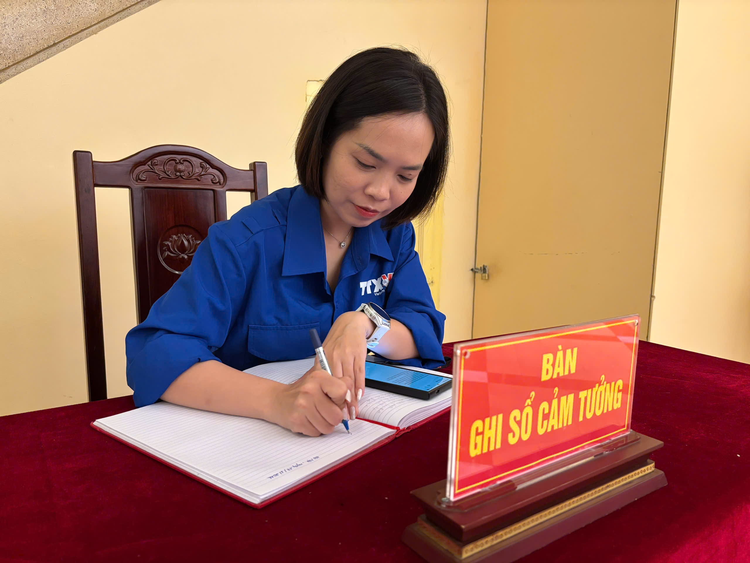 Bí thư Chi đoàn thanh niên Ban biên tập Tin kinh tế ghi sổ cảm tưởng. Ảnh: Thùy Linh/Bnews/vnanet.vn