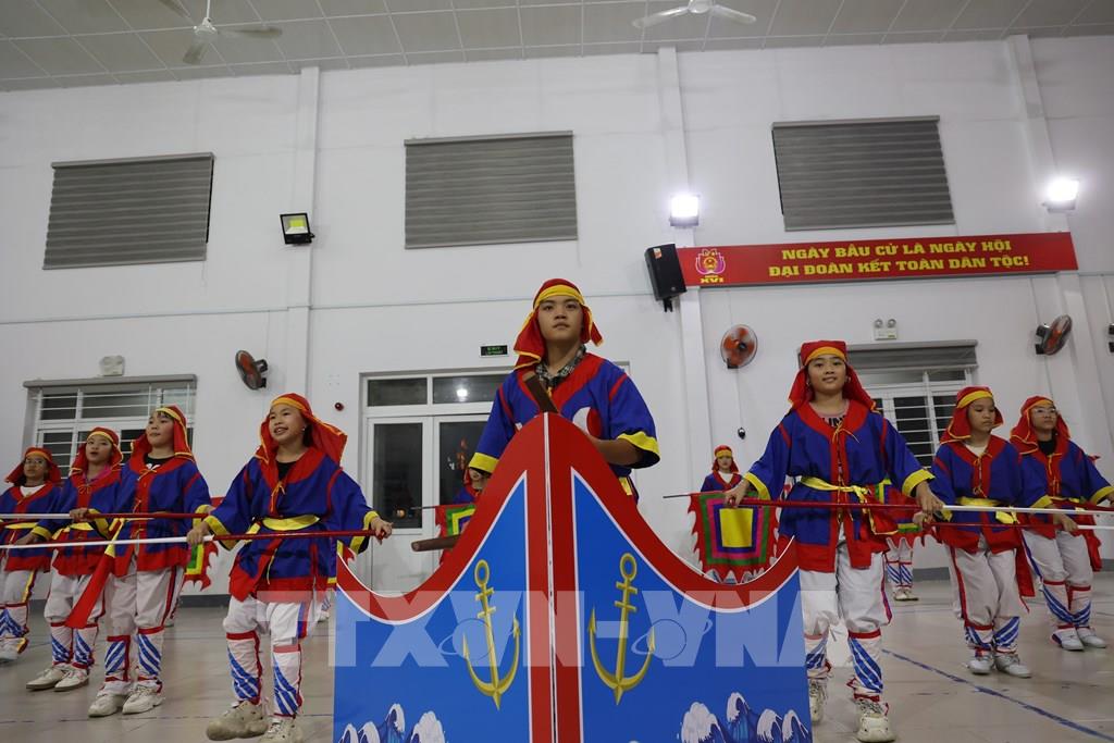 Học sinh phường Nam Trang tập luyện hò bả trạo để chuẩn bị tham gia các hội thi văn nghệ của tỉnh. Ảnh Đặng Tuấn –TTXVN