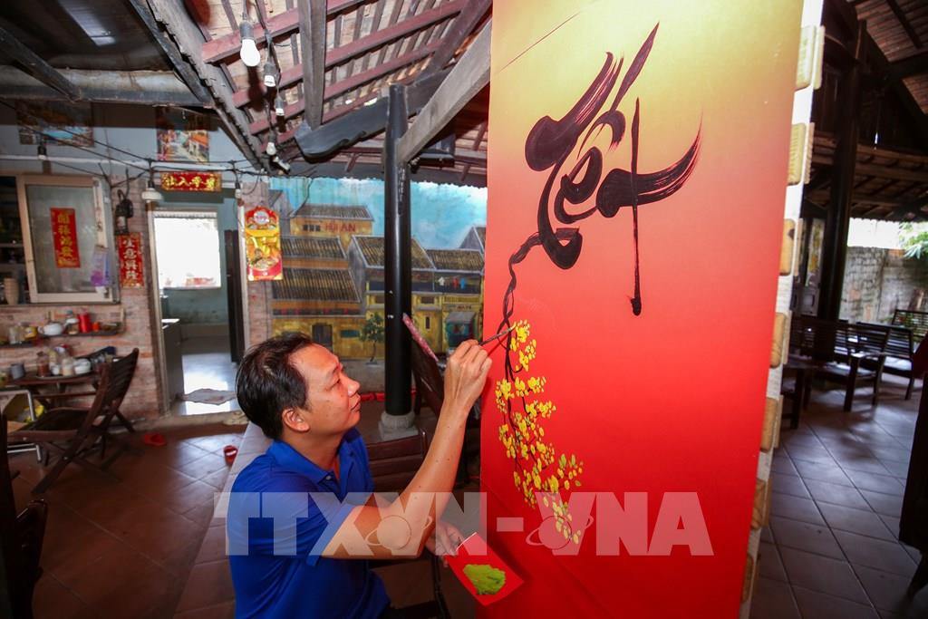 Họa sĩ Lâm Trường Sơn trực tiếp vẽ trang trí Tết tại một quán cà phê, mang hơi thở mùa xuân truyền thống vào không gian sáng tạo đương đại. Ảnh: Giang Phương – TTXVN