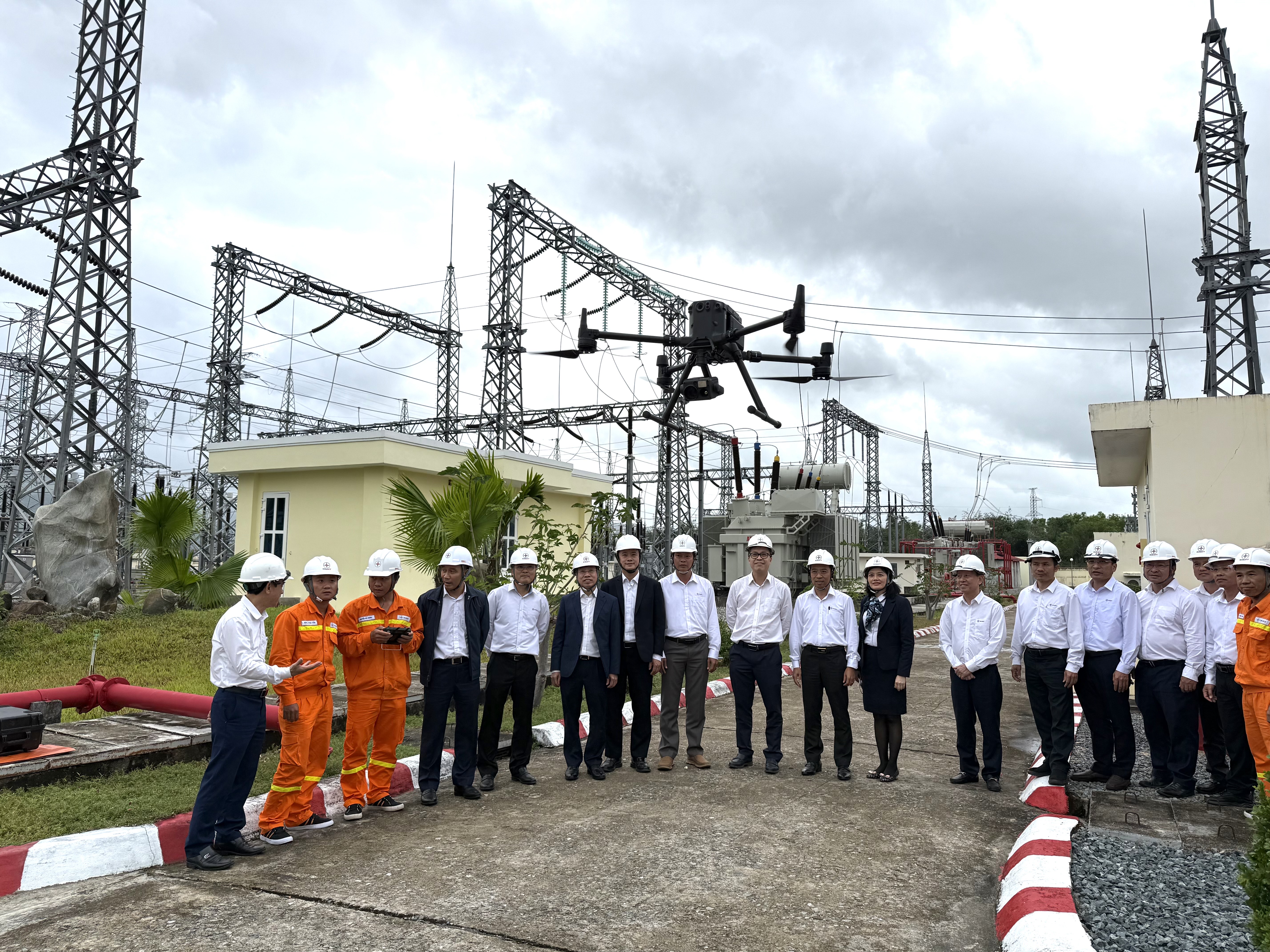 Ông Nguyễn Tuấn Tùng Chủ tịch EVNNPT kiểm tra việc ứng dụng thiết bị bay không người lái tại trạm biến áp 220kV Tuy Hòa. Nguồn: Mai Phương/Vnanet.vn/Bnews.vn