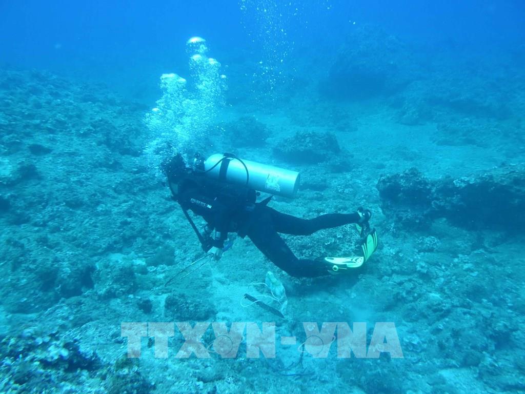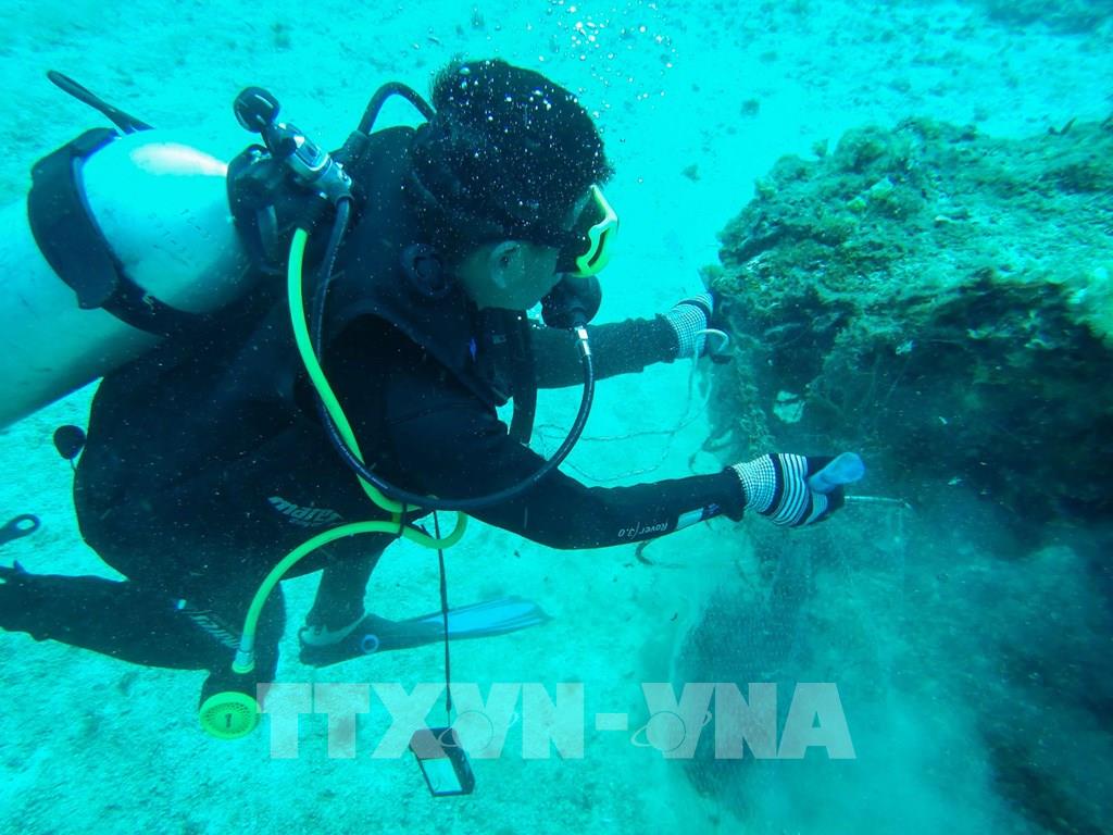 Nhân viên Ban quản lý Khu bảo tồn biển Lý Sơn định kỳ thu gom rác thải nhựa dưới rặng san hô biển tại đặc khu Lý Sơn, Quảng Ngãi. Ảnh: TTXVN