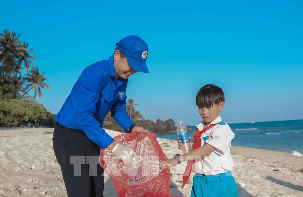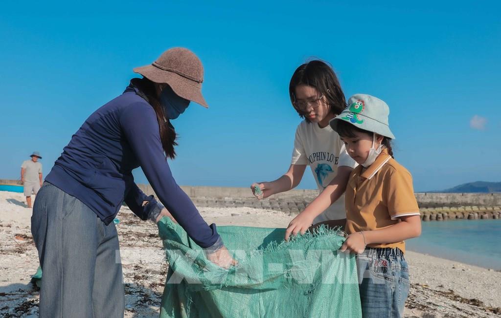 Thầy trò Trường Tiểu học số 2 An Vĩnh (điểm trường An Bình) thường xuyên ra quân dọn rác bãi biển. Hoạt động này vừa làm sạch môi trường, vừa bồi đắp ý thức bảo vệ đặc khu Lý Sơn xanh sạch. Ảnh: Phan Phương - TTXVN