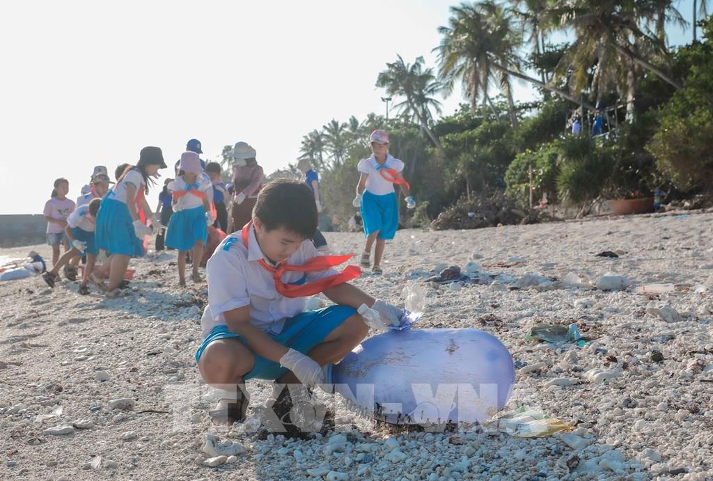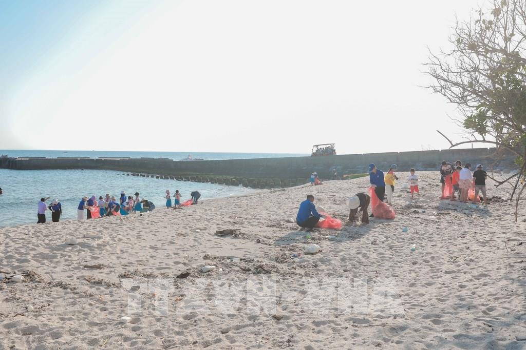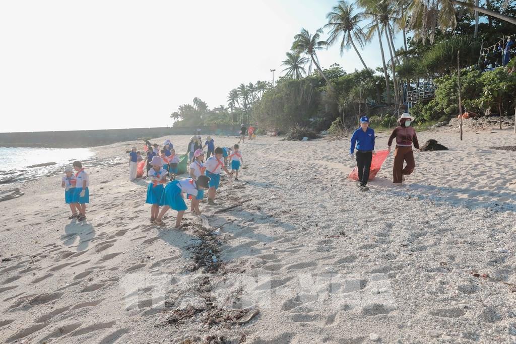 Người dân đặc khu, giáo viên và học sinh Trường Tiểu học số 2 An Vĩnh (điểm trường An Bình) hào hứng thu gom rác thải nhựa từ đại dương trôi vào bờ; hoạt động ngoại khóa không chỉ làm sạch biển mà còn nâng cao ý thức bảo vệ môi trường. Ảnh: Phan Phương – TTXVN