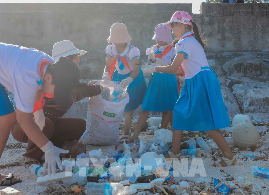 Cô trò Trường Tiểu học số 2 An Vĩnh (điểm trường An Bình) phân loại rác thải từ đại dương trôi vào bờ biển; hoạt động không chỉ làm sạch môi trường mà còn bồi đắp ý thức bảo vệ môi trường cho học sinh. Ảnh: Phan Phương - TTXVN