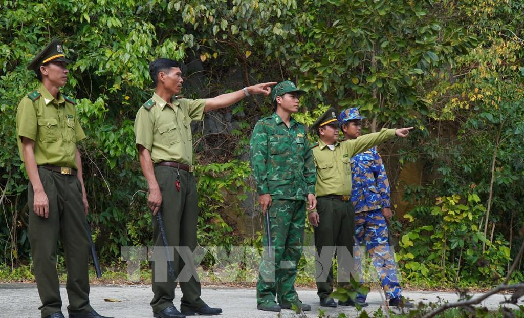 Các lực lượng trên đảo hiệp đồng tuần tra kiểm soát phòng chống cháy rừng. Ảnh: Tuấn Phi - TTXVN