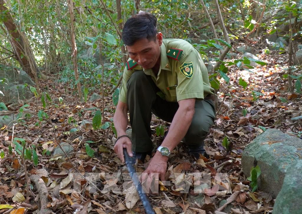 Cán bộ Kiểm lâm Hòn Khoai kiểm tra lớp thực bì tại rừng. Ảnh: Tuấn Phi - TTXVN