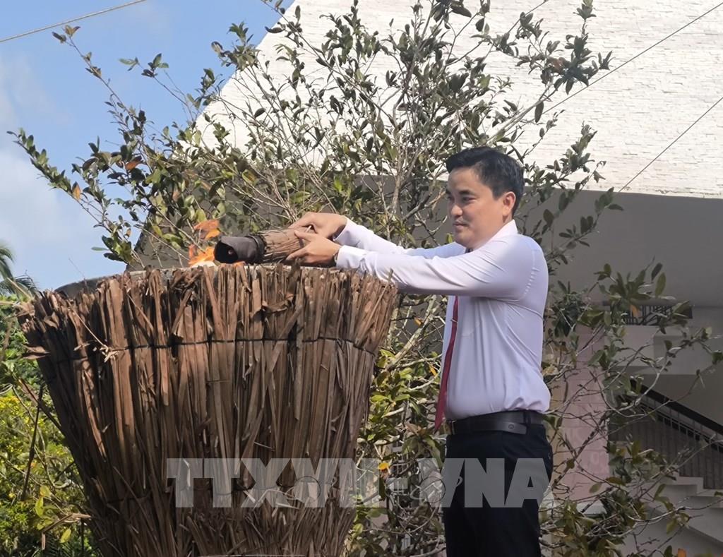 Bí thư Đảng ủy xã Đồng Khởi Nguyễn Quốc Hưng thắp ngọn đuốc truyền thống “Đồng Khởi”. Ảnh: Huỳnh Phúc Hậu - TTXVN
