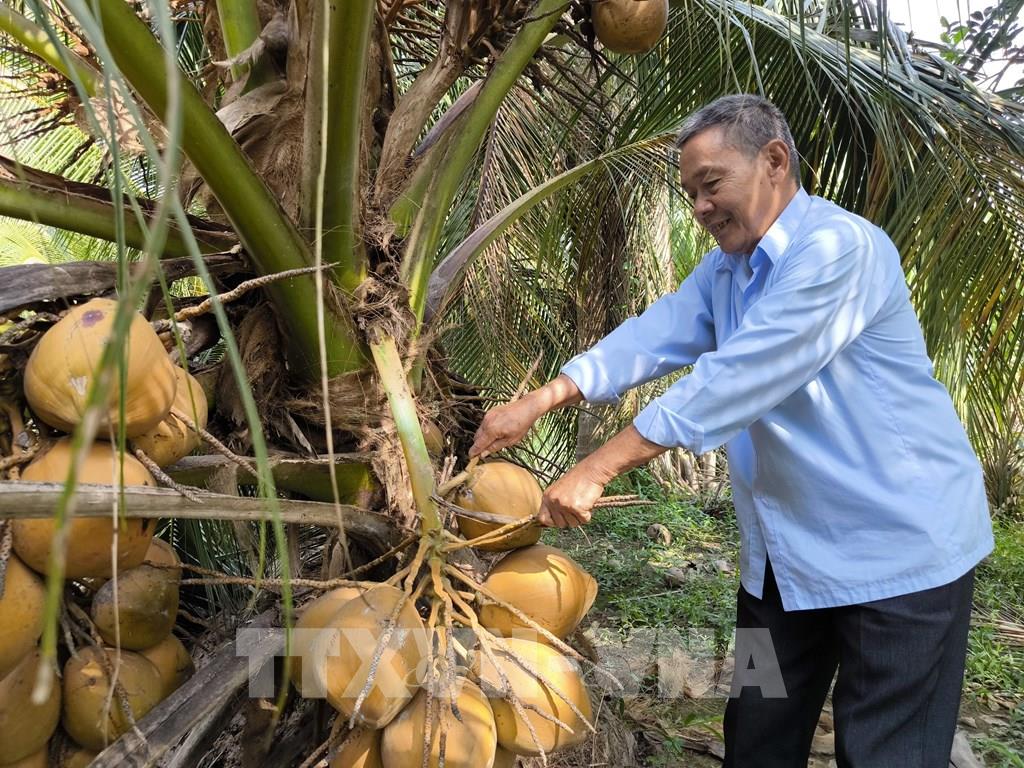 Ông Nguyễn Văn Lùn, xã Đồng Khởi, tỉnh Vĩnh Long chăm sóc vườn dừa hữu cơ của gia đình. Ảnh: Huỳnh Phúc Hậu - TTXVN
