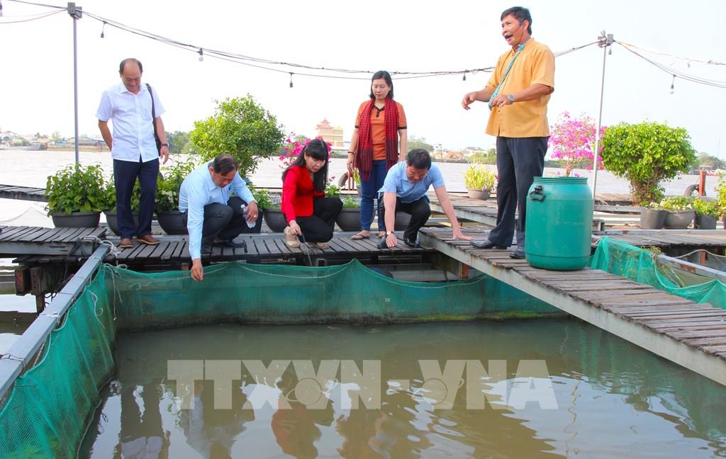 Đoàn công tác khảo sát các điểm nuôi cá bè ở Cồn Sơn. Ảnh: Nguyễn Hằng - TTXVN