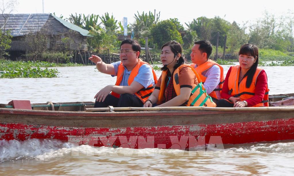 Ông Trần Văn Huyến, Phó Bí thư Thành ủy dẫn đầu đoàn khảo sát các điểm du lịch ở Cồn Sơn. Ảnh: Nguyễn Hằng - TTXVN
