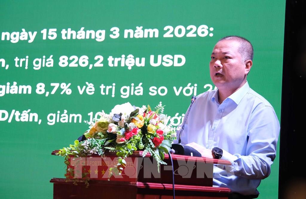 Ông Nguyễn Anh Sơn, Cục trưởng Cục Xuất nhập khẩu (Bộ Công Thương) báo cáo kết quả xuất khẩu gạo 3 tháng đầu năm 2026 tại Hội nghị. Ảnh: Thanh Liêm - TTXVN
