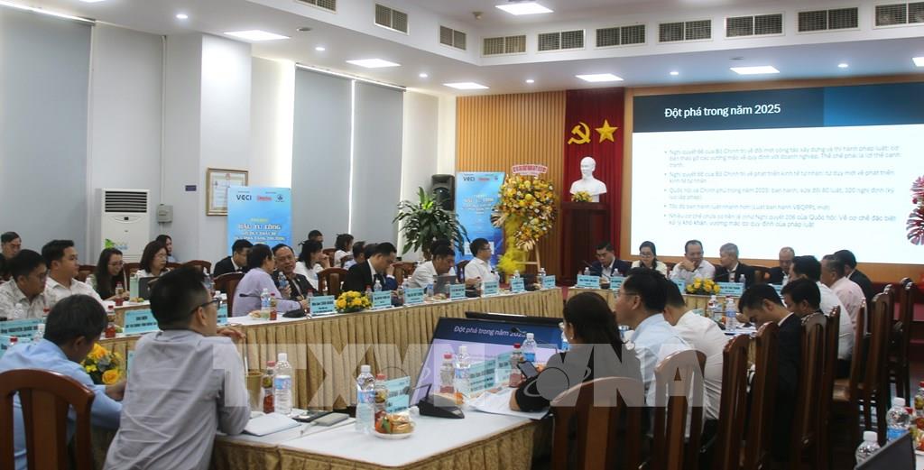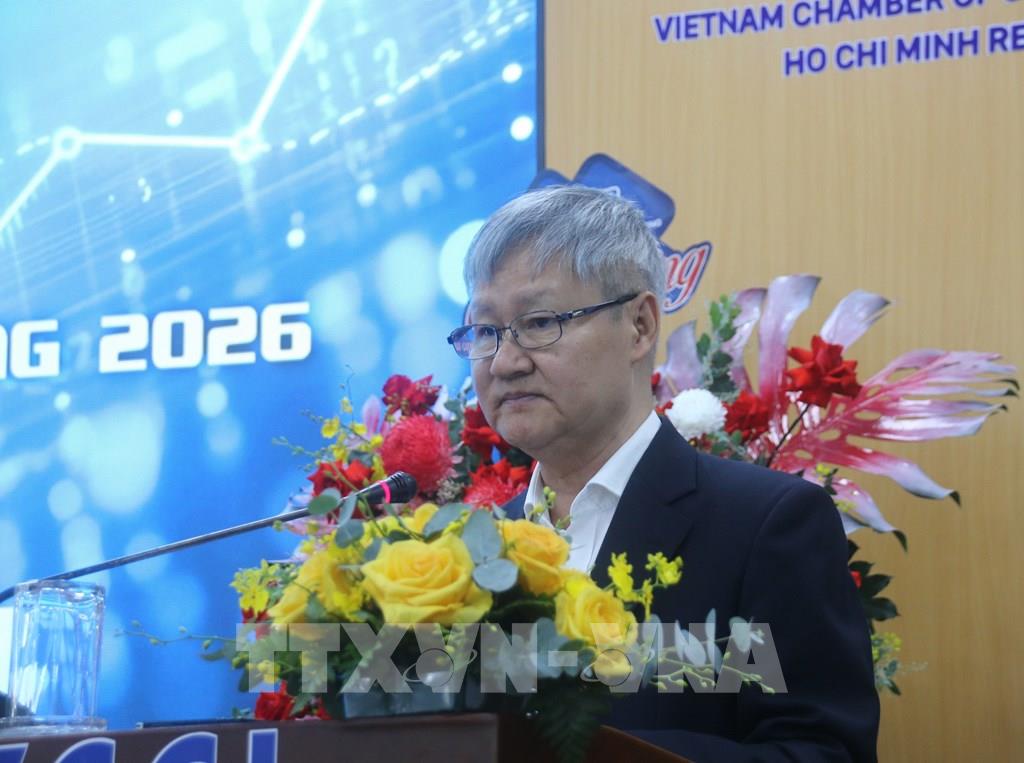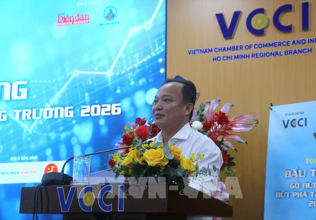 Ông Võ Tân Thành, Phó Chủ tịch Liên đoàn Thương mại và Công nghiệp Việt Nam (VCCI) phát biểu khai mạc toạ đàm. Ảnh: Hứa Chung-TTXVN
