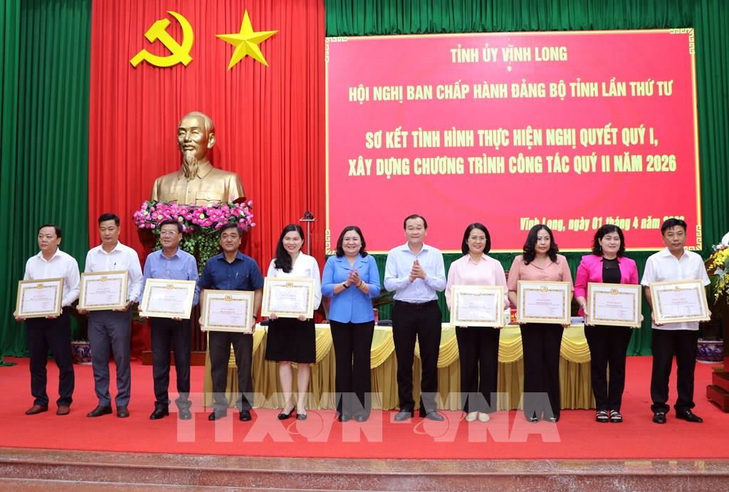 Cùng với đó, tỉnh tăng cường công tác kiểm tra, giám sát và phòng, chống tham nhũng, lãng phí, tiêu cực, nhất là ở những lĩnh vực nhạy cảm, dễ phát sinh sai phạm; chuyển mạnh từ kiểm tra sang giám sát từ sớm, từ xa; thực hiện hiệu quả các giải pháp kiểm soát quyền lực. Về phát triển kinh tế, tỉnh xác định mục tiêu tăng trưởng “hai con số” theo hướng thực chất, bền vững; chủ động tạo nguồn thu mới, động lực mới cho phát triển; chú trọng phát triển kinh tế biển, năng lượng tái tạo; khai thác hiệu quả tiềm năng, lợi thế địa phương. Đồng thời, tỉnh tiếp tục đẩy mạnh huy động các nguồn lực đầu tư phát triển, nhất là thu hút nhà đầu tư, vốn FDI; thúc đẩy xã hội hóa; xác định khoa học - công nghệ, đổi mới sáng tạo và chuyển đổi số là động lực tăng trưởng mới trong thời gian tới.Theo báo cáo của Tỉnh ủy, trong quý I/2026, Vĩnh Long đã cụ thể hóa và tổ chức thực hiện các nghị quyết, chỉ thị của Trung ương, của Tỉnh ủy đồng bộ, gắn với sắp xếp tổ chức bộ máy, kiện toàn tổ chức cơ sở đảng, bố trí cán bộ và vận hành mô hình chính quyền địa phương 2 cấp, bảo đảm sự lãnh đạo xuyên suốt của Đảng trong toàn hệ thống chính trị. Công tác bầu cử đại biểu Quốc hội khóa XVI và đại biểu HĐND các cấp nhiệm kỳ 2026-2031 được tổ chức dân chủ, đúng pháp luật, an toàn, tiết kiệm; tỷ lệ cử tri tham gia bỏ phiếu đạt 99,99%.