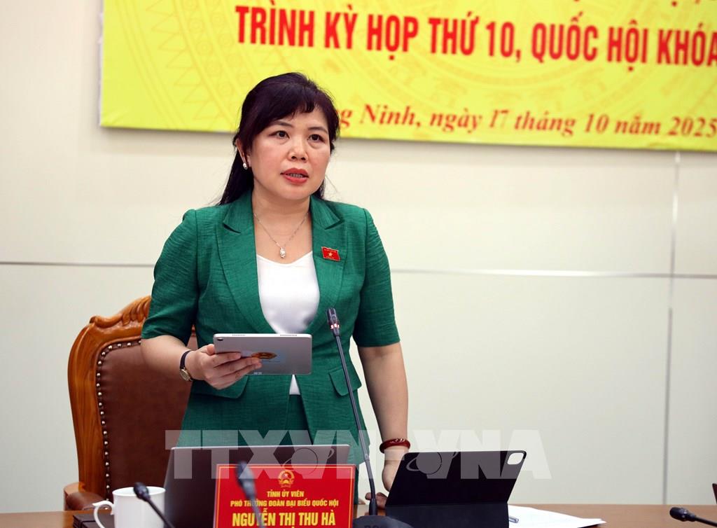 Bà Nguyễn Thị Thu Hà, Phó Trưởng đoàn Đoàn đại biểu Quốc hội tỉnh Quảng Ninh, chủ trì hội nghị. Ảnh: Đức Hiếu - TTXVN