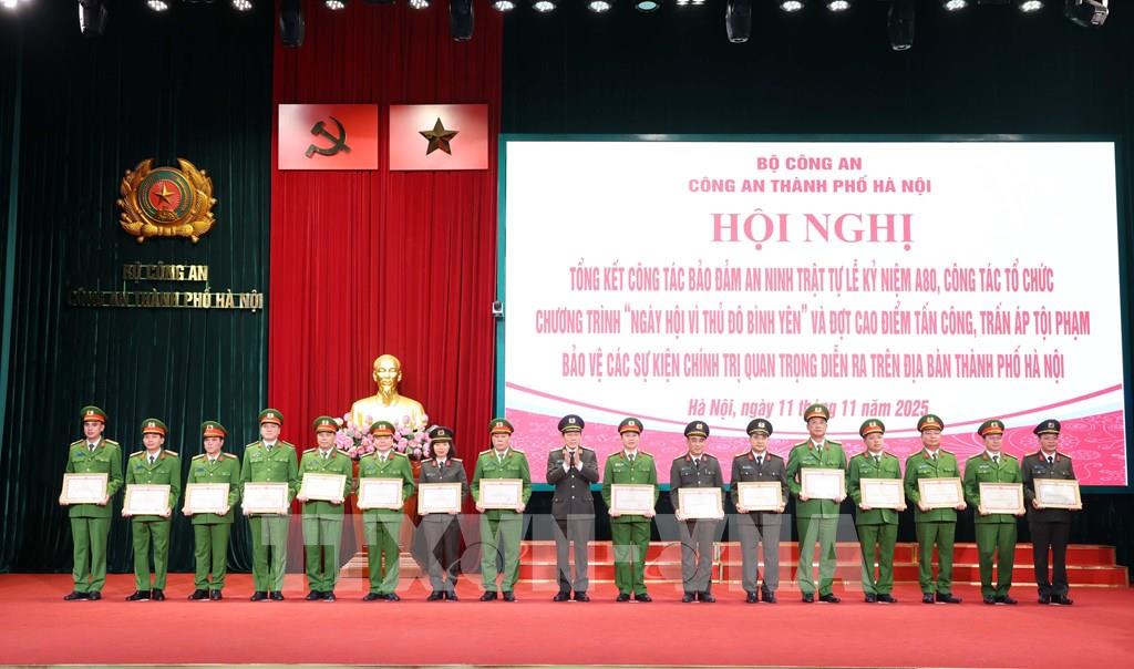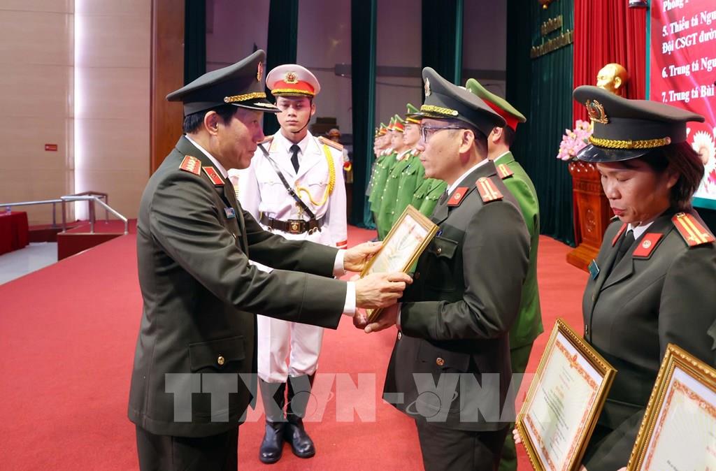 Đại tướng Lương Tam Quang, Bộ trưởng Bộ Công an trao Bằng khen cho các cá nhân và tập thể có thành tích xuất sắc. Ảnh: Phạm Kiên - TTXVN