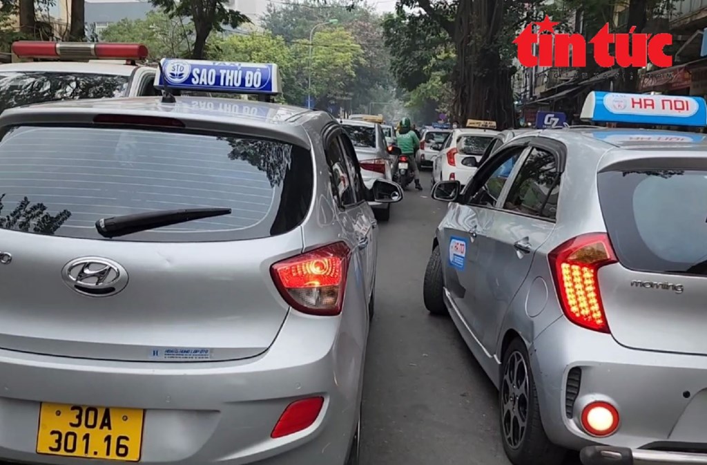 Hai hàng taxi song song trên phố Phủ Doãn trước cổng Bệnh viện Việt Đức, Hà Nội gây ùn tắc giao thông. Ảnh: Tin Tức/TTXVN