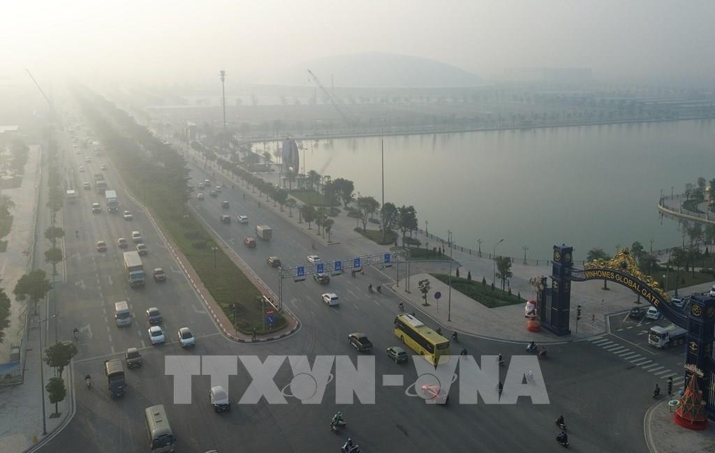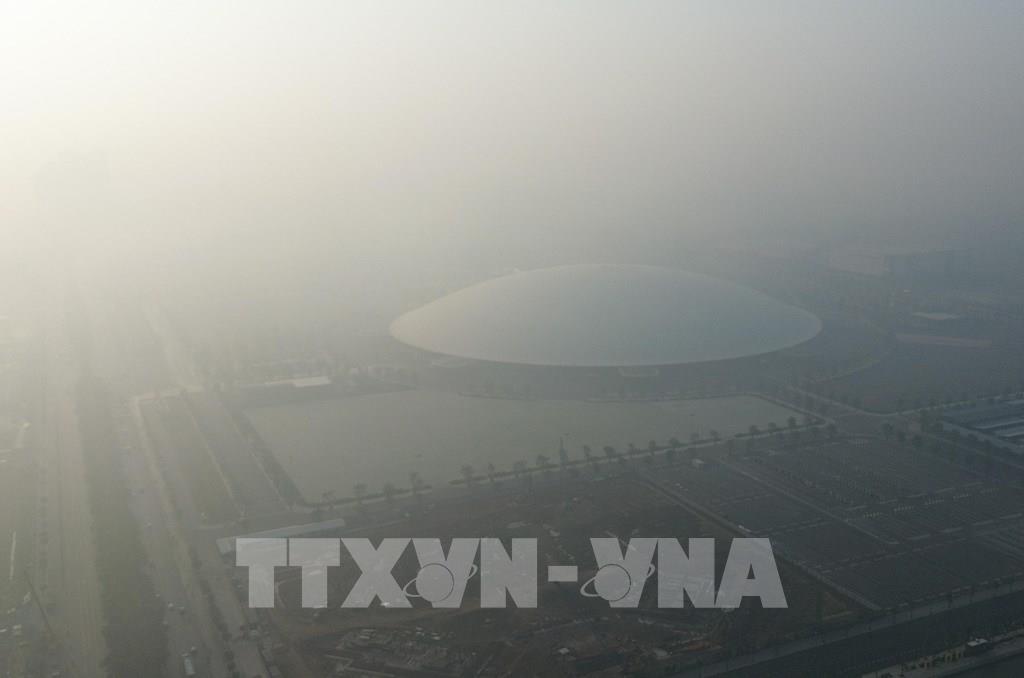 Khu vực Trung tâm Hội chợ Triển lãm Quốc gia (xã Đông Anh, thành phố Hà Nội) chìm trong bụi mịn và sương mù dày đặc. Ảnh: Phan Phương - TTXVN