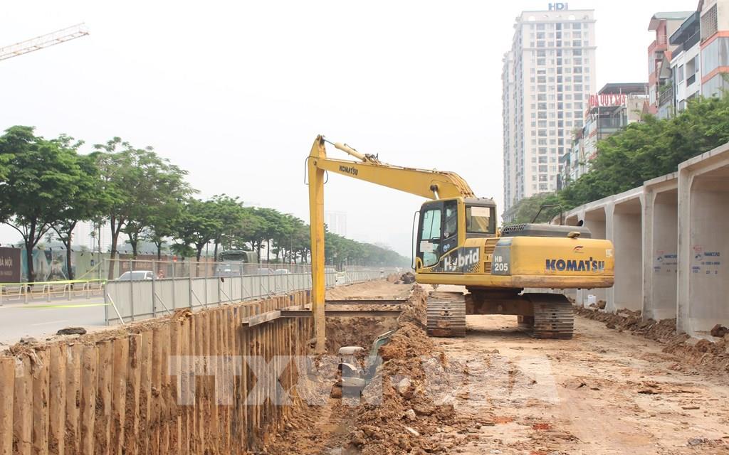 Đẩy nhanh tiến độ các hạng mục công trình tiêu thoát nước để xử lý úng ngập trên đường Võ Chí Công. Ảnh: Nguyễn Thắng - TTXVN