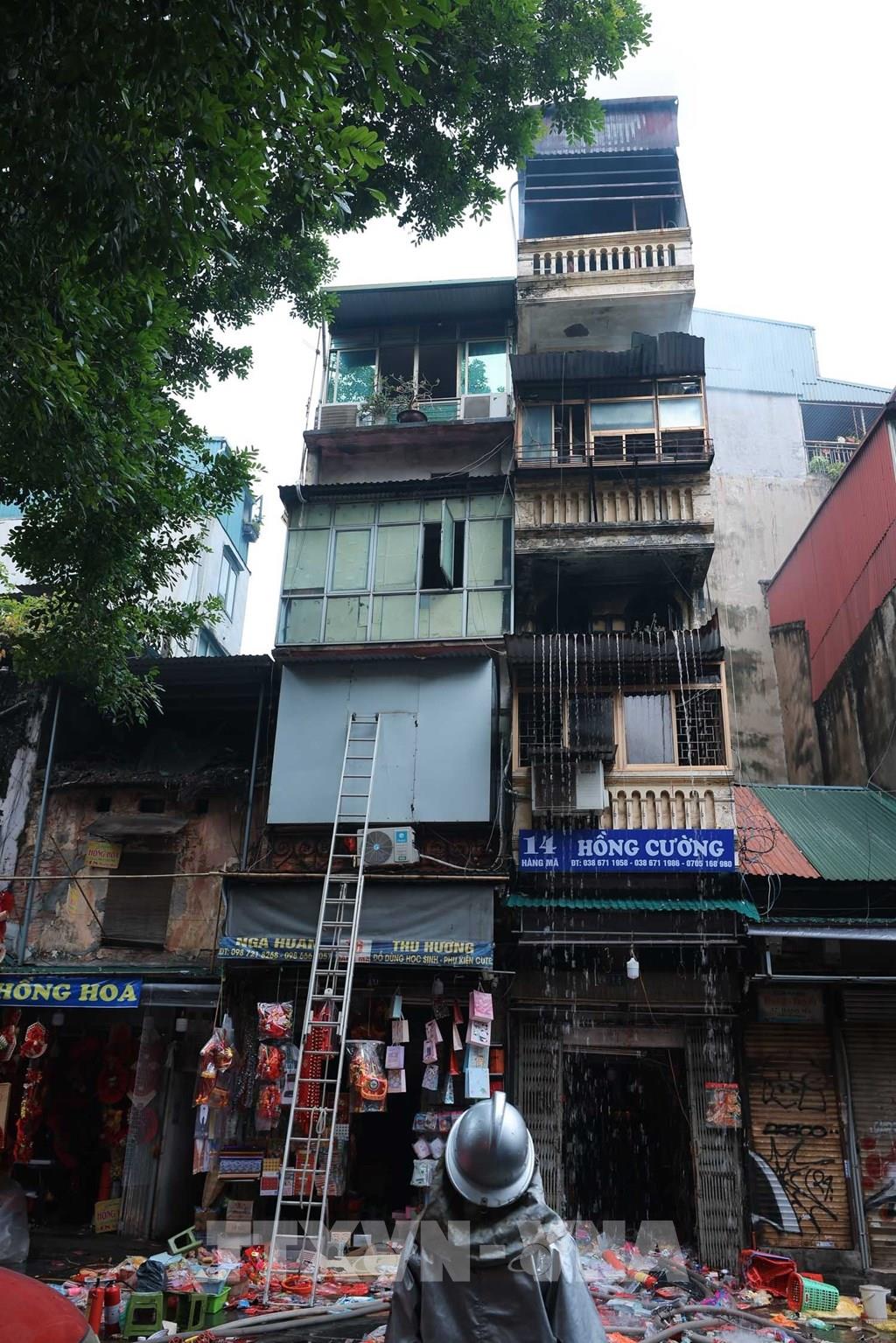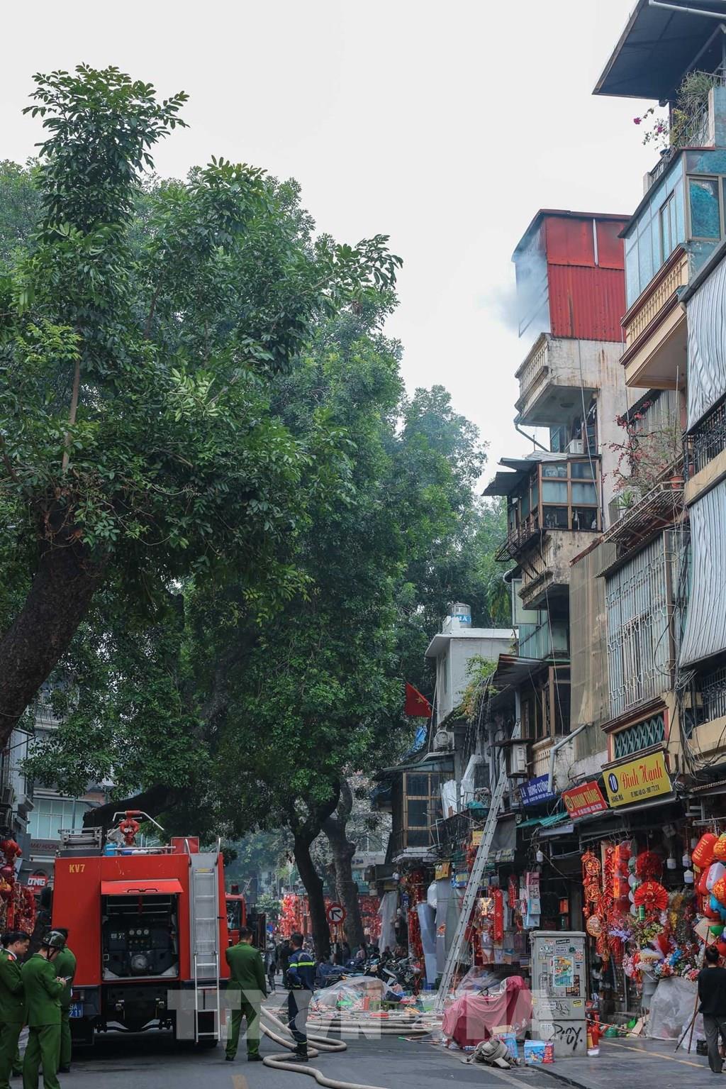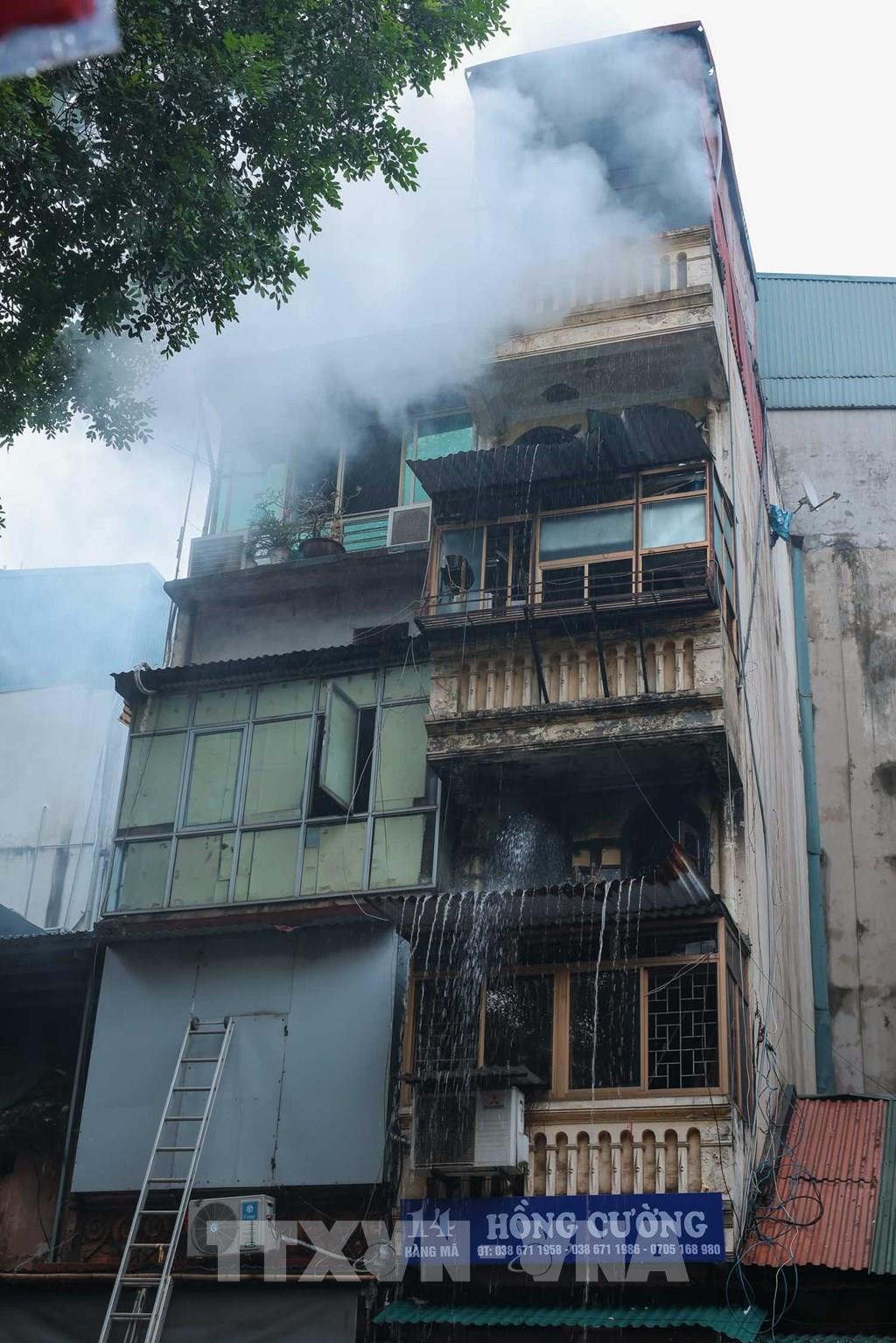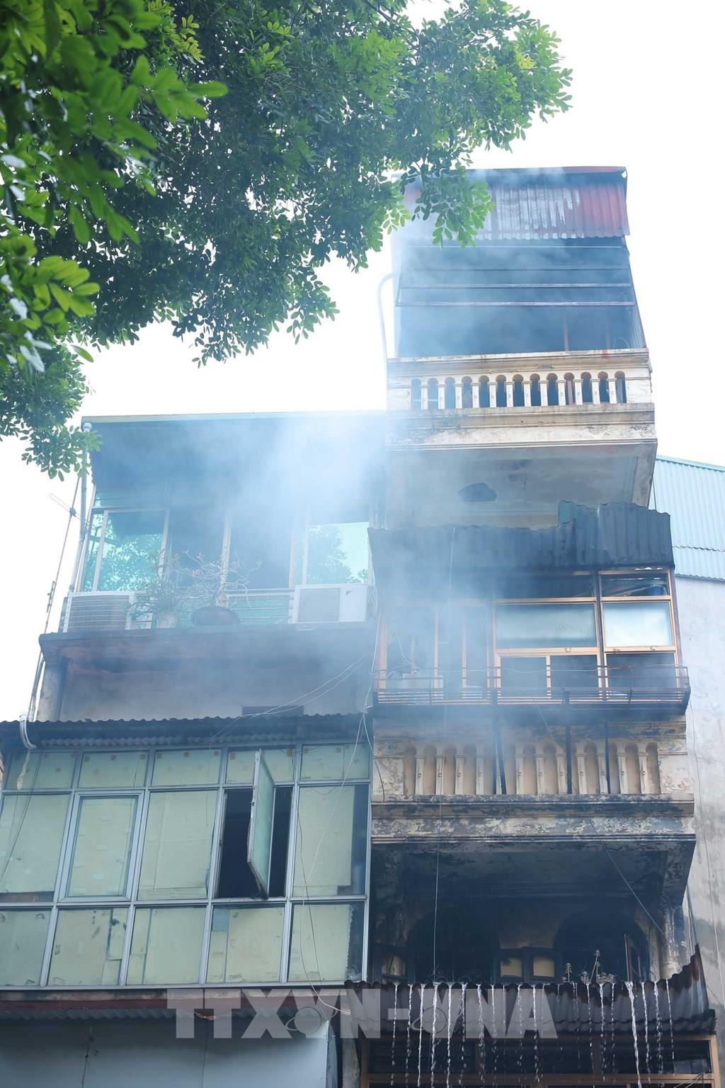 10h30, khói vẫn bốc lên tại tầng 5 nhà 14 phố Hàng Mã. Ảnh: Hoàng Hiếu - TTXVN