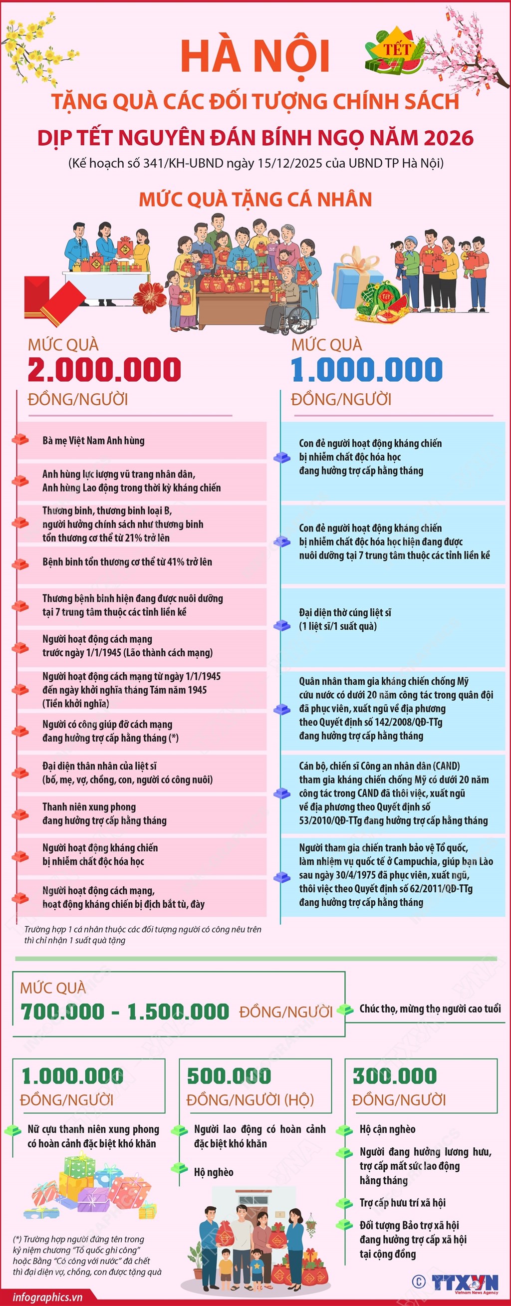 Hà Nội vừa ban hành Kế hoạch tặng quà tới các đối tượng hưởng chính sách, người có công; người đang hưởng lương hưu, trợ cấp mất sức lao động hằng tháng, trợ cấp hưu trí xã hội; hộ nghèo; hộ cận nghèo; đối tượng bảo trợ xã hội; người cao tuổi; công nhân viên chức lao động có hoàn cảnh đặc biệt khó khăn; nữ cựu thanh niên xung phong có hoàn cảnh khó khăn; thăm hỏi tặng quà các tổ chức, cá nhân tiêu biểu, đơn vị thực hiện chính sách nhân dịp Tết Nguyên đán Bính Ngọ năm 2026.